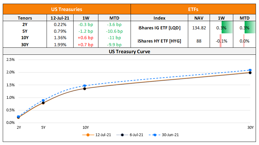 US primary market issuances dropped to just $2.3bn vs. $13.2bn in the week prior on the back of the July 4th holiday and an overall risk-off sentiment. This is the lowest issuance for the same weekly period since 2009. IG issuances fell last week to a mere $1.7bn vs. $9.6bn in the prior week and HY issuances were also lower to just $375mn vs. $3.1bn in the prior week. The IG space saw only three deals – PacificCorp’s $1bn deal followed by Equitable Financial Life’s $500mn and Affiliated Managers’ $200mn issuances. In the HY space, there was only one deal, Masonite International’s $375mn issuance. In North America, there were a total of 24 upgrades and 12 downgrades combined across the three major rating agencies last week. LatAm saw $711mn vs. $3.5bn in issuances in the prior week. Issuances were led by Minerva’s $400mn and Pan American Energy’s $280mn issuances. EU Corporate G3 issuances were slightly higher at $23.2bn vs. $17.3bn in the week prior – KfW’s $4.24bn issuance led the table followed by Cie de Financement Foncier’s €1.5bn ($1.8bn) and Enel’s $900mn issuances. Across the European region, there were 20 upgrades and 11 downgrades across the three major rating agencies. Overall, GCC and Sukuk G3 issuances fell to $1.7bn vs. $13.6bn in the week prior led by Sharjah’s $740mn and Dukhan Bank’s $500mn Sukuk issuances besides QNB’s $400mn issuance. Across the Middle East/Africa region, there were no upgrades and 4 downgrades across the three major rating agencies. APAC ex-Japan G3 issuances rose ~40% to $14bn vs. $10.25bn in the prior week – Prosus NV’s ~$3.7bn multi-currency issuance led the table, followed by Xiaomi’s $1.2bn dual-trancher, Pakistan’s $1bn three-trancher tap and Westpac NZ’s €750mn ($886mn) deal. In the Asia ex-Japan region, there was 1 upgrade and 4 downgrades combined across the three major rating agencies last week.