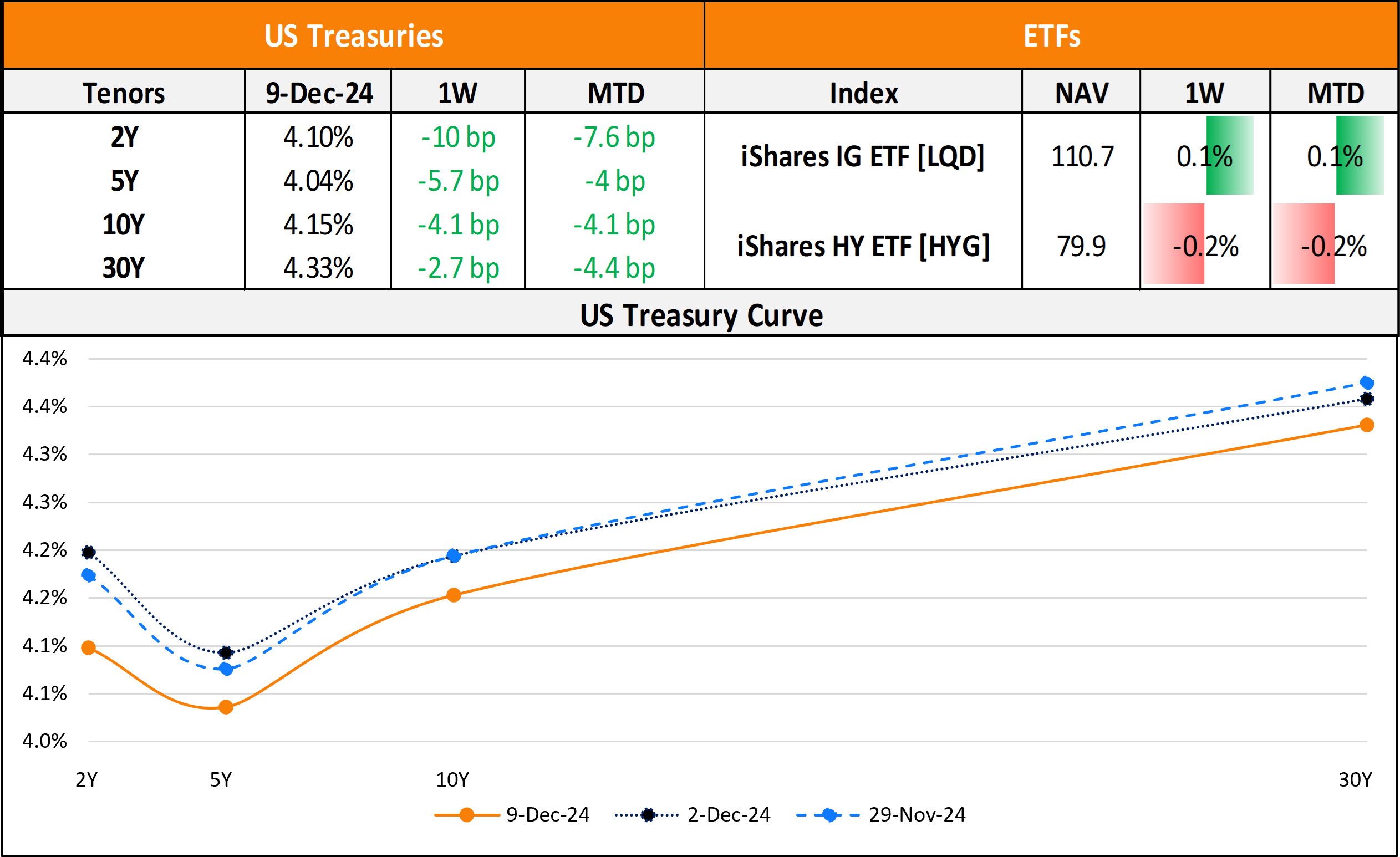 US primary market issuances more than doubled last week to $24.7bn vs. $10.7bn seen in the week prior to it. IG issuers took up $19.6bn of the total, led by CVS’ $3bn two-part deal, followed by Tapestry and Coterra Energy raising $1.5bn via dual-tranchers each. Last week saw $5.1bn in HY issuances from the region, led by Iron Mountain’s $1.2bn deal and UWM Holdings’ $800mn deal. In North America, there were a total of 31 upgrades and downgrades each, across the three major rating agencies last week. US IG funds saw $2bn in inflows during the week ended December 4, adding to the $690mn of inflows seen during the week before that. HY funds witnessed net inflows of $429mn during the same period, reversing the $54mn outflow in the prior week.