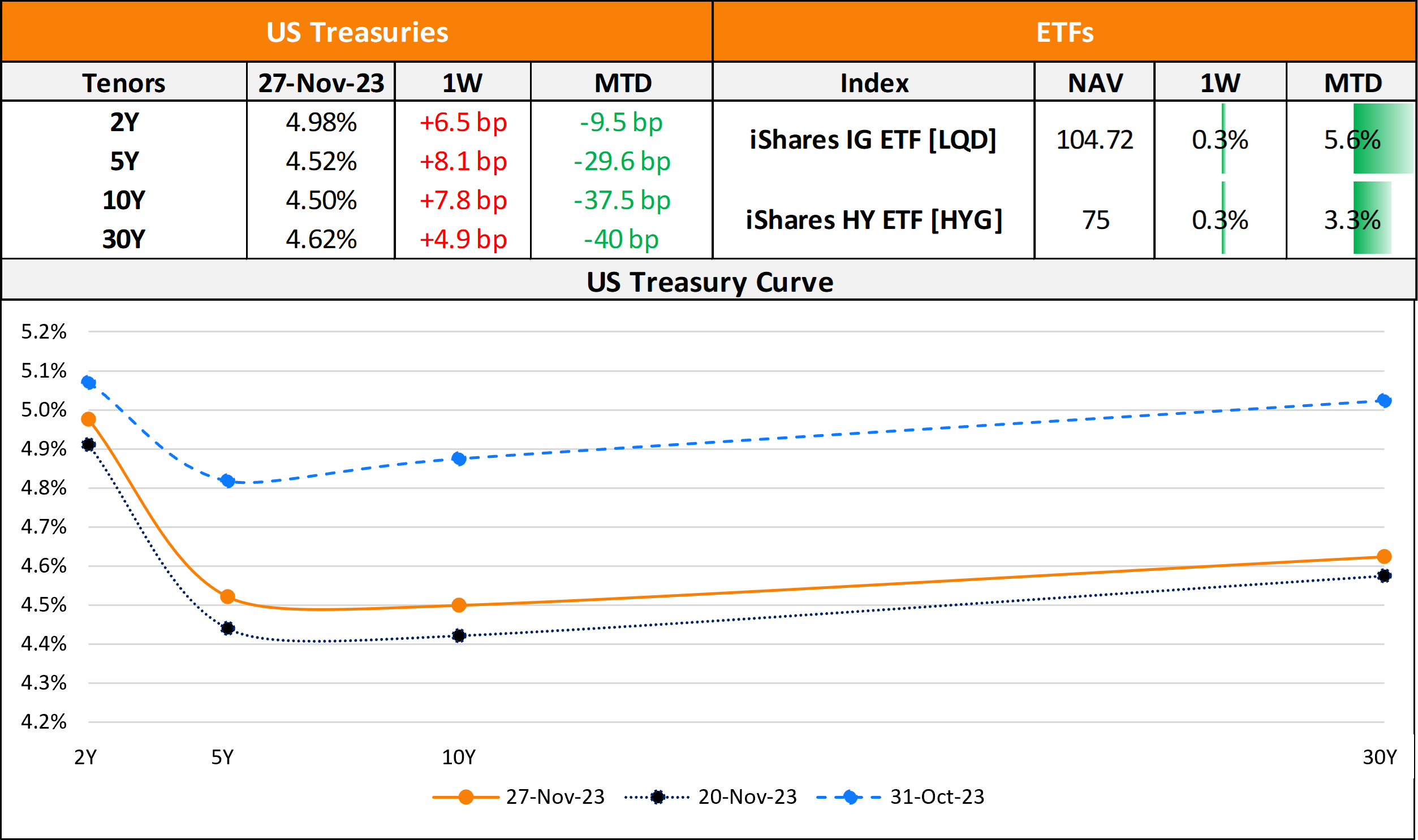 US primary market new deals dropped significantly last week to just $2.5bn vs. $41bn a week prior due to a shortened week on account of the Thanksgiving holidays. Deal volumes were taken completely by IG issuers led by Consolidated Edison’s $2.5bn and Norfolk Southern’s $1bn dual-tranchers each. In North America, there were a total of 40 upgrades and 37 downgrades across the three major rating agencies last week.