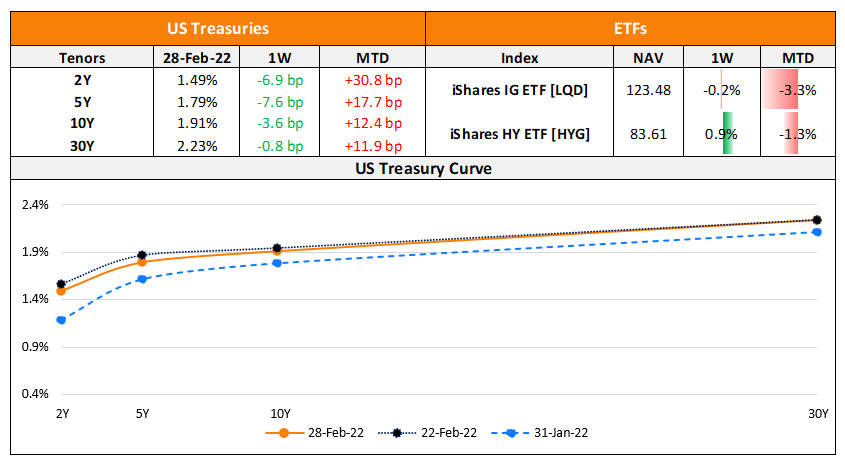 With a risk-off week due to the Russia-Ukraine military attacks, US Treasury yields swung wildly. The US 10Y yield dropped 10bp intraday early last week once news of Russia’s military attack on Ukraine broke out. US primary market issuances dropped to $17.2bn vs. $27.5bn in the week prior. Most of last week’s new deals were from investment grade (IG) corporates with $15.7bn in issuances and $1bn from high yield (HY) corporates. In comparison, the week prior to last week saw $27.5bn in IG deals and no HY deals. Last week’s deals were led by Wells Fargo raising $4bn, Aon’s $1.5bn via a two-trancher and ConocoPhillips’ $1.1bn issuance. Twitter’s $1bn was the only HY deal. In North America, there were a total of 26 upgrades and 13 downgrades combined across the three major rating agencies last week. LatAm saw $3.6bn vs. $2.5bn in issuances in the week prior led by Dominican Republic’s $3.56bn two-part deal besides other minor deals. In South America, there was 1 upgrade and downgrade each across the major rating agencies. EU Corporate G3 issuances were slightly higher at $23.2bn vs. $27.1bn in the week prior, led by ING Bank’s €8bn three-trancher, KfW’s €5bn issuance and Credit Mutuel’s $2bn to-trancher. Across the European region, there were 12 upgrades and 7 downgrades across the three major rating agencies. GCC G3 issuance were at $750mn vs. $105mn in the week before with First Abu Dhabi Bank and QIB Finance raising $500mn and $250mn each. Across the Middle East/Africa region, there were 2 upgrades and 3 downgrades across the three major rating agencies. APAC ex-Japan G3 issuances stood at $6.4bn vs. $8.3bn led by Huatai Securities’ $1bn deal, CDB Leasing’s $950mn two-trancher, China Travel’s $700mn issuance and AgBank of China’s $600mn deal. In the APAC region, there were 14 upgrades and 10 downgrades combined across the three major rating agencies last week.