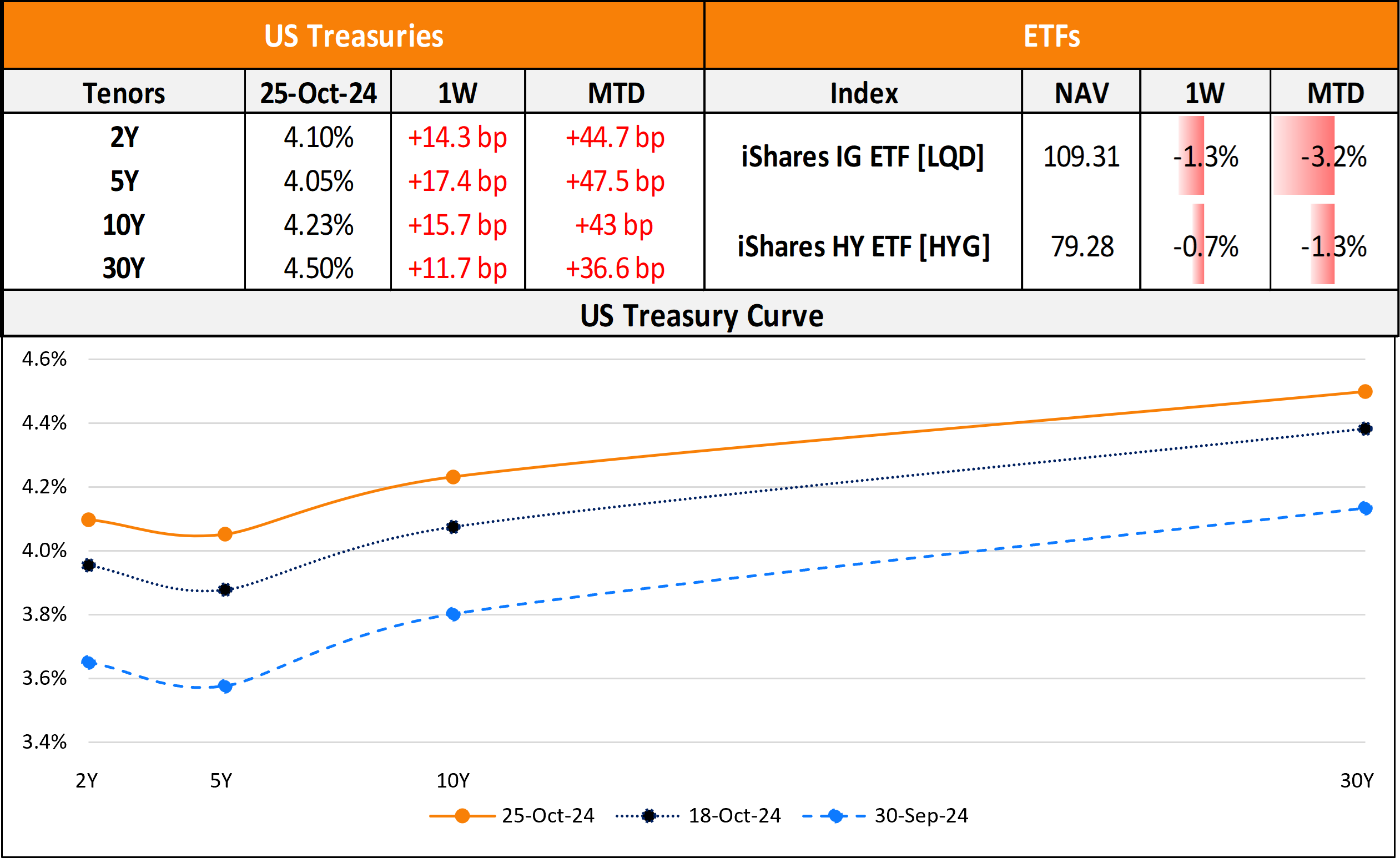 EU Corporate G3 issuances almost doubled last week to $30.9bn vs. $15.4bn in the prior week. LBBW’s €6.5bn multi-tranche issuance and Grupo BPCE’s €4.6bn six-part deal led the tables. The region saw 38 upgrades and 60 downgrades, across the three major rating agencies. The GCC dollar primary bond market saw $731mn in new deals compared to no deals seen in the prior week. GFH Financial’s $500mn sukuk deal led the tables. In the Middle East/Africa region, there were 1 upgrade and 2 downgrades across the major rating agencies. LatAm saw $1.4bn in issuances last week vs. $2.9bn in the week prior to it. Issuance volumes were led by Aris Mining’s $450mn deal and Mexico Remittances Funding Estate’s $350mn deal each. The South American region saw 6 upgrades and 2 downgrades across the rating agencies.