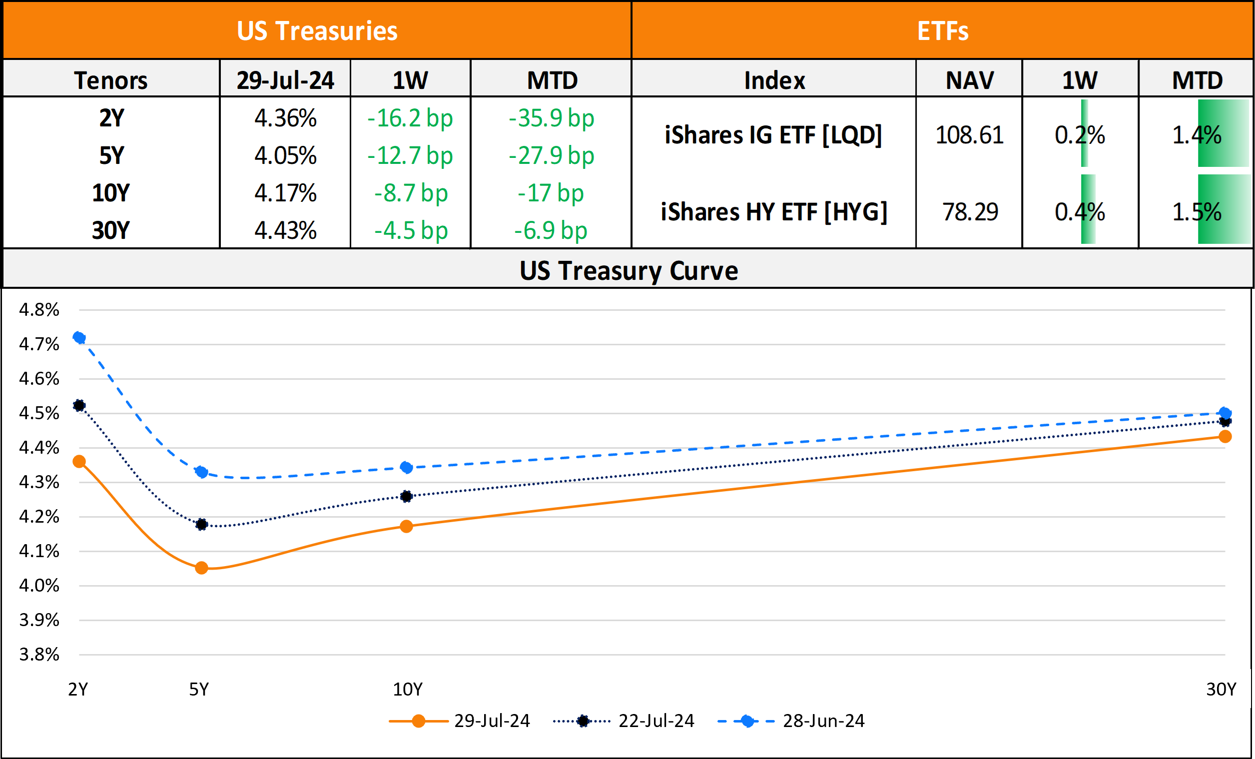 US primary market issuances jumped to $61.4bn last week from $43.6bn in the week prior to it. IG issuers took up $55.1bn of the total, led by Morgan Stanley’s $25bn jumbo issuance followed by United Health’s $12bn eight-tranche issuance. HY issuers accounted for $5.75bn of the volume with Citi’s and Venture Global Partner’s $1.5bn deal each leading the tables. In North America, there were a total of 49 upgrades and 20 downgrades across the three major rating agencies last week. US IG funds saw slight outflows of $34.1mn for the week ending July 24 compared to $1.27bn of inflows seen in the prior week. HY funds saw $1.53bn in inflows, adding to the $2.64bn inflows seen a week before this.