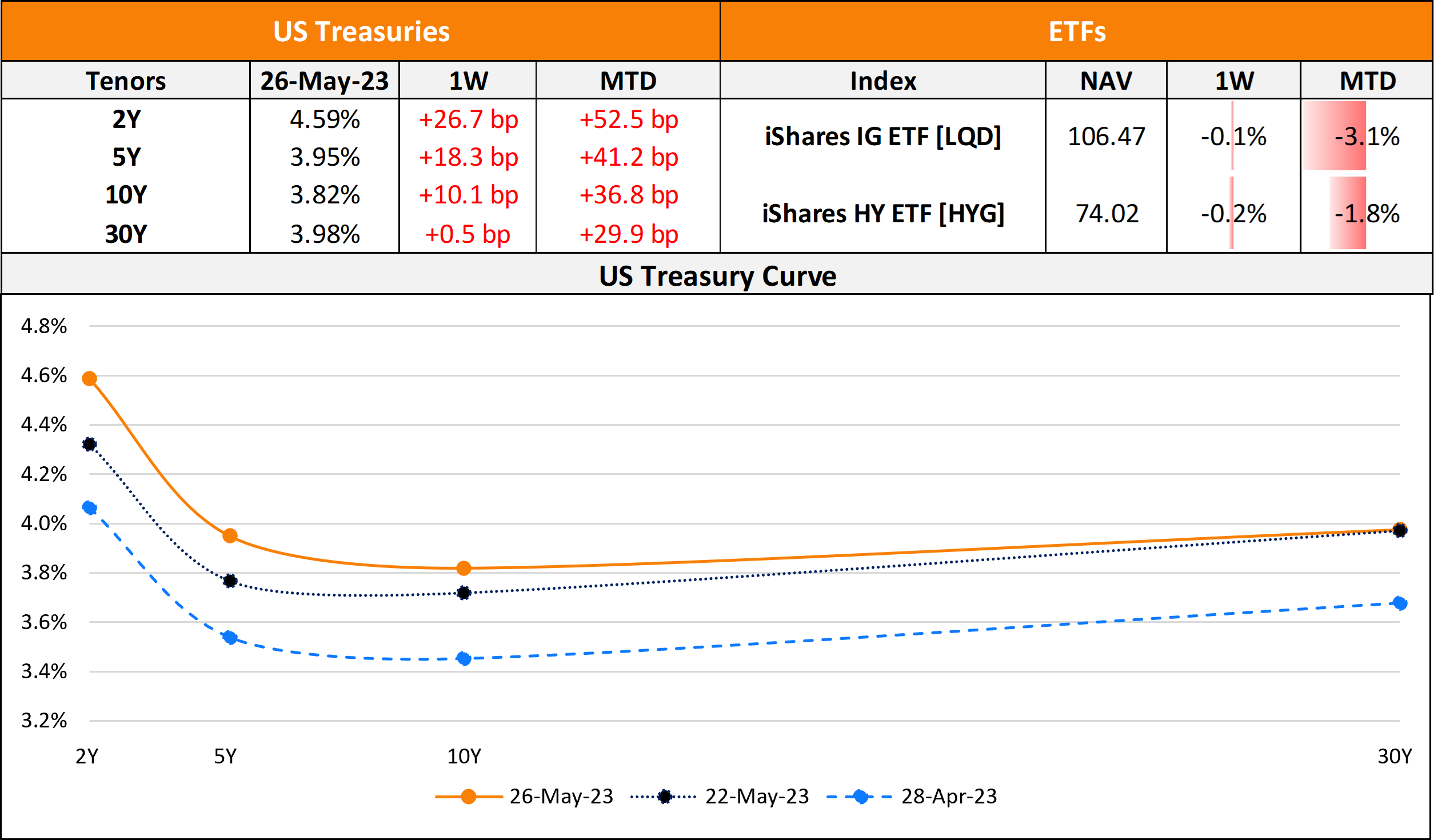 With a massive change in market expectations of a rate hike amid continued growth and sticky inflation, treasury yields have soared. The 2Y yield was up by over 26bp last week and almost 53bp higher MTD. 10Y yields were up 10bp last week with the MTD rise at 37bp. US primary markets saw a large drop in new deals last week to $19.8bn as compared to $64.8bn in deals a week prior to it. Of this, IG deals accounted for $15.6bn led by Citigroup’s $3.2bn issuance and Lockheed Martin’s $2bn three-trancher. HY saw $4.1bn in new deals led by Olympus Water’s $1.7bn deal and Seagate’s $1bn two-trancher. In North America, there were a total of 13 upgrades and 44 downgrades across the three major rating agencies last week. US IG bond funds saw $3bn in a fourth straight week of inflows for the week ended May 24, adding to $2.16bn in inflows from the prior week. HY funds on the other hand saw a reversal in flows with $1.4bn in inflows, following four straight weeks of outflows.