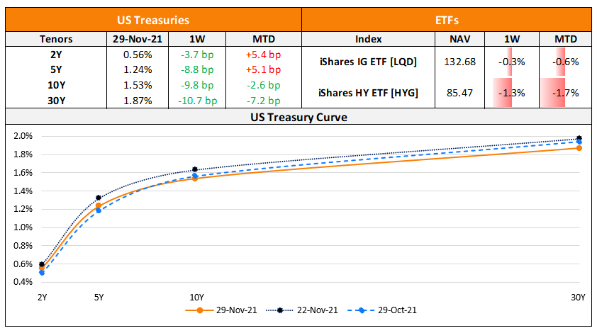 US primary markets saw a sharp decrease in issuances last week given the Thanksgiving holidays to just $3.7bn vs. $44.1bn in the prior week. IG issuances dropped to $3bn vs. $33.7bn in the prior week and HY saw almost no new deals vs. $9.2bn in the week before. CDW LLC’s $2.5bn three-trancher led the table followed by RGA Global’s $500mn deal. In North America, there were a total of 16 upgrades and 8 downgrades combined across the three major rating agencies last week. LatAm too saw no issuances as compared to $980mn in the week prior. In South America, there were 2 upgrades and 3 downgrades combined across the major rating agencies. EU Corporate G3 issuances saw a drop to $23.4bn vs. $33.9bn in the week prior with EDF raising $1.75bn, and Banque Federative du Crédit Mutuel, SocGen and Rabobank raising $1.5bn each. Across the European region, there were 6 upgrades and 21 downgrades across the three major rating agencies. The GCC also saw no G3 issuances vs. $645mn in deals in the prior week. Across the Middle East/Africa region, there were 0 upgrades and 1 downgrade across the three major rating agencies. APAC ex-Japan G3 issuances also saw a sharp dip to $2.2bn vs. $11.4bn in the week before. The largest deals were led by Chengdu Communications’ $600mn deal and Yankuang Group’s $500mn deal, followed by China Everbright and Hafoo raising $300mn each. In the Asia ex-Japan region, there were 4 upgrades and 7 downgrade combined across the three major rating agencies last week.