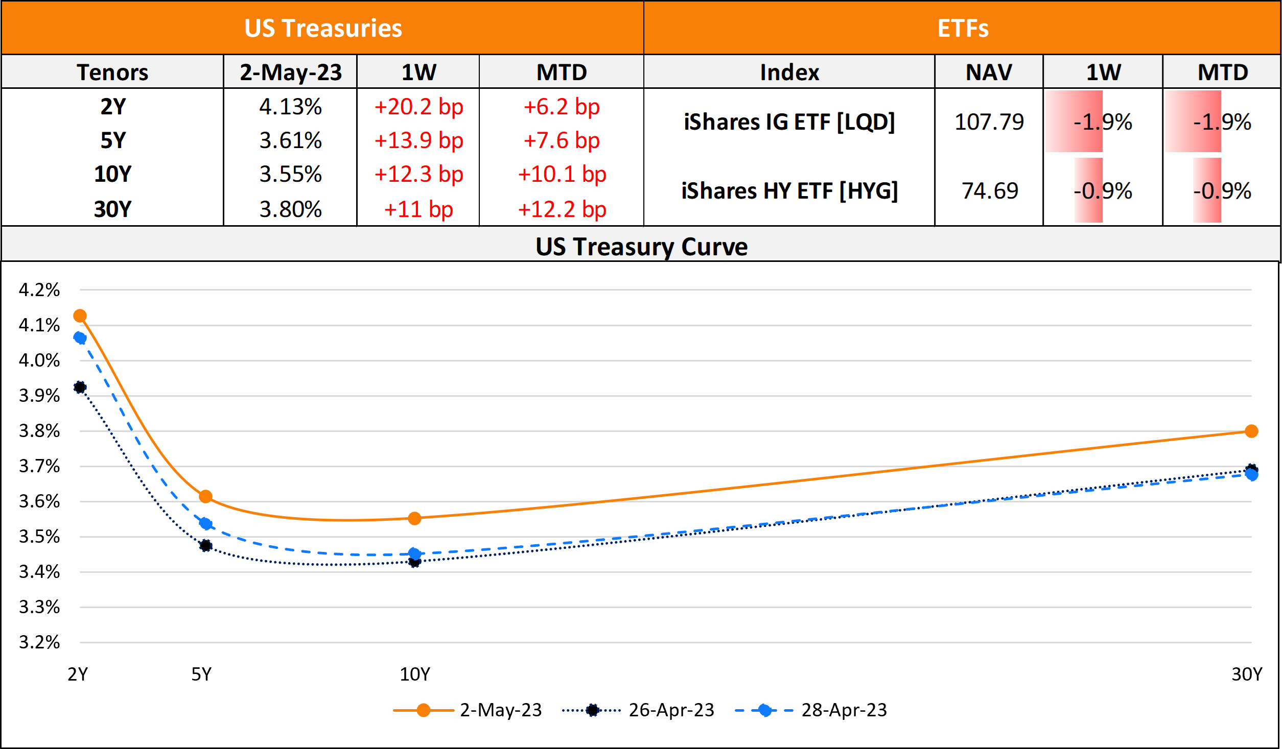 US primary markets saw $14bn in new deals last week as compared to $29bn in new deals a week prior to it. Of the deal volumes, IG issuers raised $11.2bn in new issuances led by Enterprise Holdings’ $3bn three-trancher and American Express’s $2.5bn dual-trancher. HY saw $1.4bn in new deals with Six Flags Entertainment and Trident TPI raising $800mn and $600mn respectively. In North America, there were a total of 33 upgrades and 45 downgrades across the three major rating agencies last week. US IG bond funds saw $1.32bn in outflows for the week ended April 26, reversing the $1.14bn in inflows seen in the week prior to it. HY funds saw $594mn in inflows adding to the $3.1bn in inflows the week before, a fourth straight week of inflows.