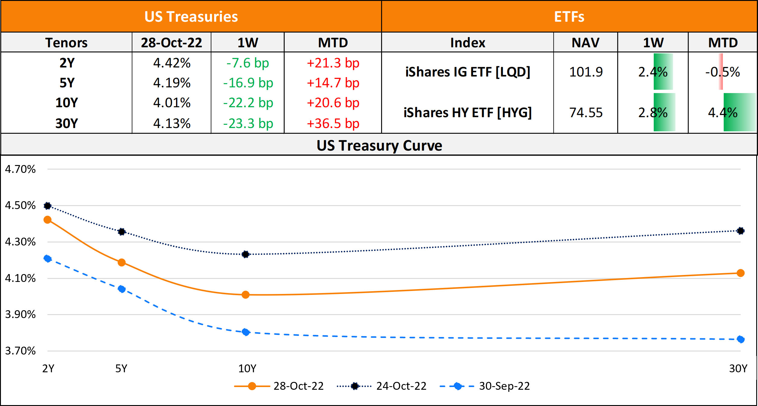 US primary market issuances were higher at $25.7bn vs. $15.4bn in the week prior, solely led by IG issuances with UnitedHealth’s $9bn jumbo seven-tranche deal and Goldman Sachs’ $2bn deal leading the tables. In North America, there were a total of 17 upgrades and 39 downgrades across the three major rating agencies last week. As per Lipper data, US IG funds saw a $368mn in outflows in the week ended October 26, a tenth straight week of outflows while HY funds saw $2.8bn in inflows. LatAm saw no new deals last week vs. $1bn in deals in the week prior to it. In South America, there was 1 upgrade and 30 downgrades across the major rating agencies. EU Corporate G3 issuance rose to $27.9bn vs. $24.8bn one week prior – banking majors HSBC’s $6.25bn three-trancher and Barclays’ $5bn three-trancher led the tables. Across the European region, there were 24 upgrades and 68 downgrades. The GCC G3 primary bond market saw no issuances last week as compared to $6.7bn in the week prior. Across the Middle East/Africa region, there was 1 upgrade and 11 downgrades across the three major rating agencies. APAC ex-Japan G3 issuances were at only $410mn vs. $4.5bn in the week prior with only two deals – Yichun Investment & Development raising $210mn and Korea Development Bank raising $200mn. In the APAC region, there were no upgrades and 13 downgrades combined across the three rating agencies last week.