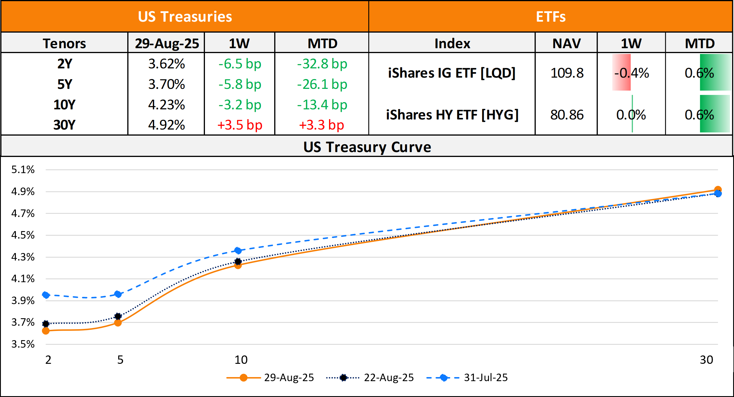 US primary market issuances dropped sharply to just $1.3bn vs. $23.5bn in the prior week. IG issuers took up $1.2bn of the total, led by Sempra’s $800mn issuance and Sammons Financial’s $400mn deal. There were no HY issuances. In North America, there were a total of 19 upgrades and 3 downgrades, across the three major rating agencies last week. US IG funds saw $1.8bn in inflows during the week ended August 27, adding to the $3.4bn inflows seen during the week before that. US HY bond funds saw $708mn in outflows, reversing the $185mn inflows seen in the prior week.