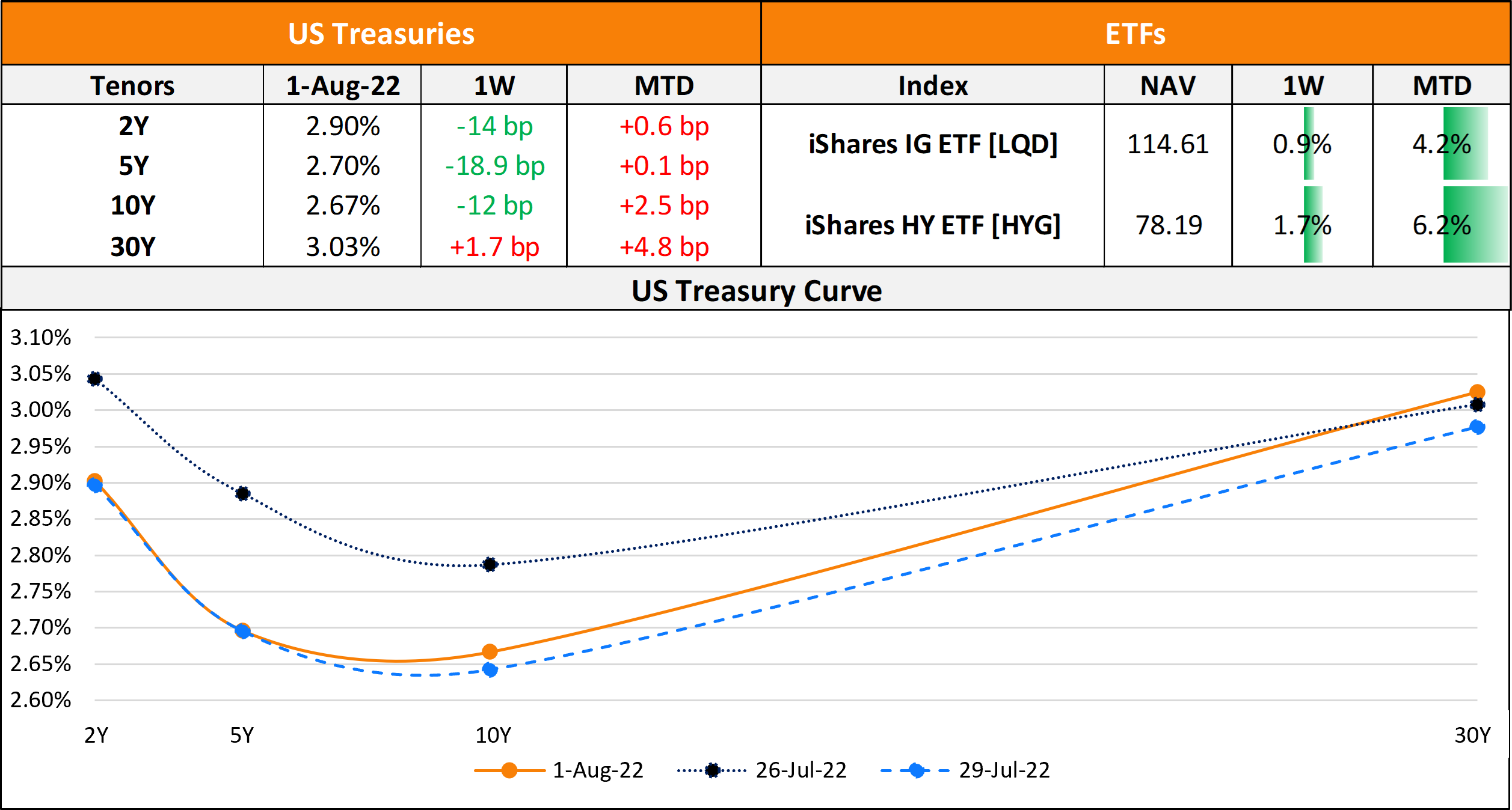 US primary market issuances fell to $16.4bn vs. $40.1bn in the previous week. IG issuances stood at $15.2bn vs. $39.2bn in the week prior, led by American Express and Truist Financial raising $3.5bn and $2.5bn respectively via two-tranche deals. In the HY space, issuances rose to $1.2bn from $760mn in the week prior, led by Avient raising $725mn. In North America, there were a total of 19 upgrades and 16 downgrades across the three major rating agencies last week. US IG funds’ losing streak continues for its eighteenth consecutive week, seeing a $2.44bn outflow in the week ended 29 July as per Lipper data. Conversely, HY funds saw an inflow of $4.83bn. In the LatAm region, there were no new deals vs. $1.2bn in the week prior. In South America, there were no upgrades and 7 downgrades across the major rating agencies. EU Corporate G3 issuance dipped 50% to $4.5bn led by NRW Bank raising $1bn, followed by BAWAG P.S.K. raising $750mn via a dual-trancher. Across the European region, there were 27 upgrades and 65 downgrades across the three major rating agencies. The GCC G3 region had no new deals for the third straight week. Across the Middle East/Africa region, there was 1 upgrade and 8 downgrades across the three major rating agencies. APAC ex-Japan G3 region issuances fell to $2.1bn vs. $5bn in the week prior – Posco raised $1bn via a dual trancher, followed by Lotte raising $300mn. In the APAC region, there were 3 upgrades and 14 downgrades combined across the three rating agencies last week.