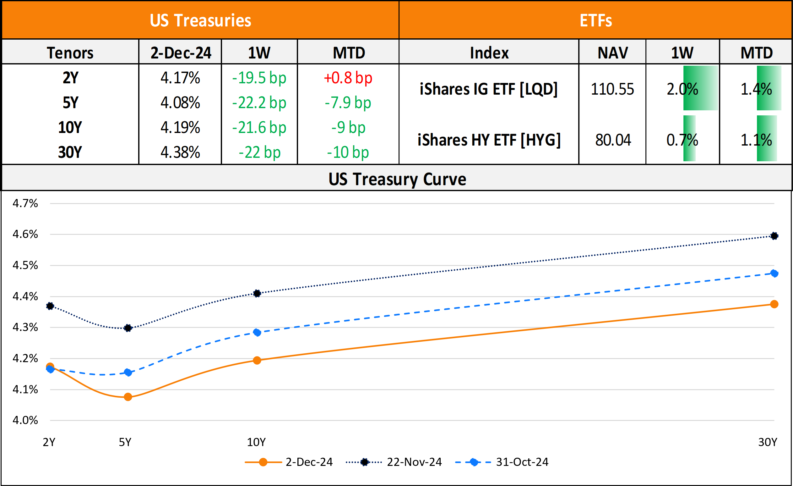 US primary market issuances dropped last week to $10.7bn vs. $28.9bn seen in the week prior to it. IG issuers took up $9.9bn of the total, led by ConocoPhillips’ $5.2bn five-part deal, followed by Wells Fargo’s and Citigroup’s $2.5bn and $1.5bn issuances respectively. Last week saw $713mn in HY issuances from the region, led solely by Blackstone’s $450mn deal and P&L Global’s $263mn deal. In North America, there were a total of 37 upgrades and 24 downgrades across the three major rating agencies last week. US IG funds saw $1.86bn of inflows during the week ended November 27, adding to the $4.6bn of inflows seen during the week before that. HY funds witnessed net outflows of $57.8mn during the same period, reversing the $451.4mn of inflows in the prior week.
