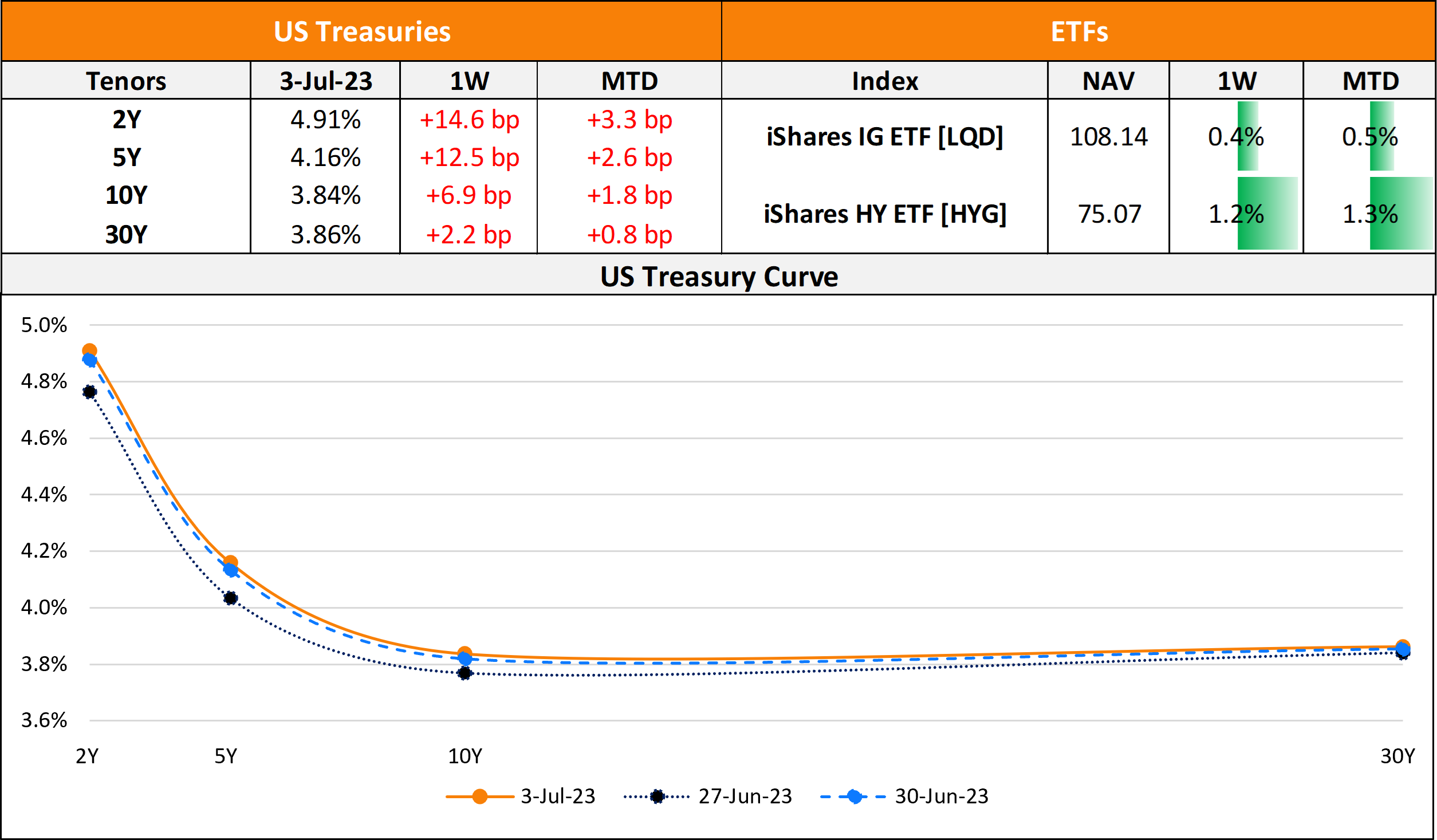 US primary markets saw a drop in new deals last week to $7.1bn as compared to $17.7bn a week prior. Of this, IG deals accounted for $4.3bn led by Prologis’ $2bn three-trancher and Hyatt’s $60mn deal. HY saw $2.3bn in new deals with Vikings’ $720mn and Howard Midstream $550mn deal. In North America, there were a total of 25 upgrades and 34 downgrades across the three major rating agencies last week. US IG bond funds saw $919.2mn in inflows for the week ended June 28, adding to the $2.17bn in inflows during the week prior. For the same period, HY funds saw $729.8mn in inflows adding to the $265.2mn in inflows seen in the week prior.