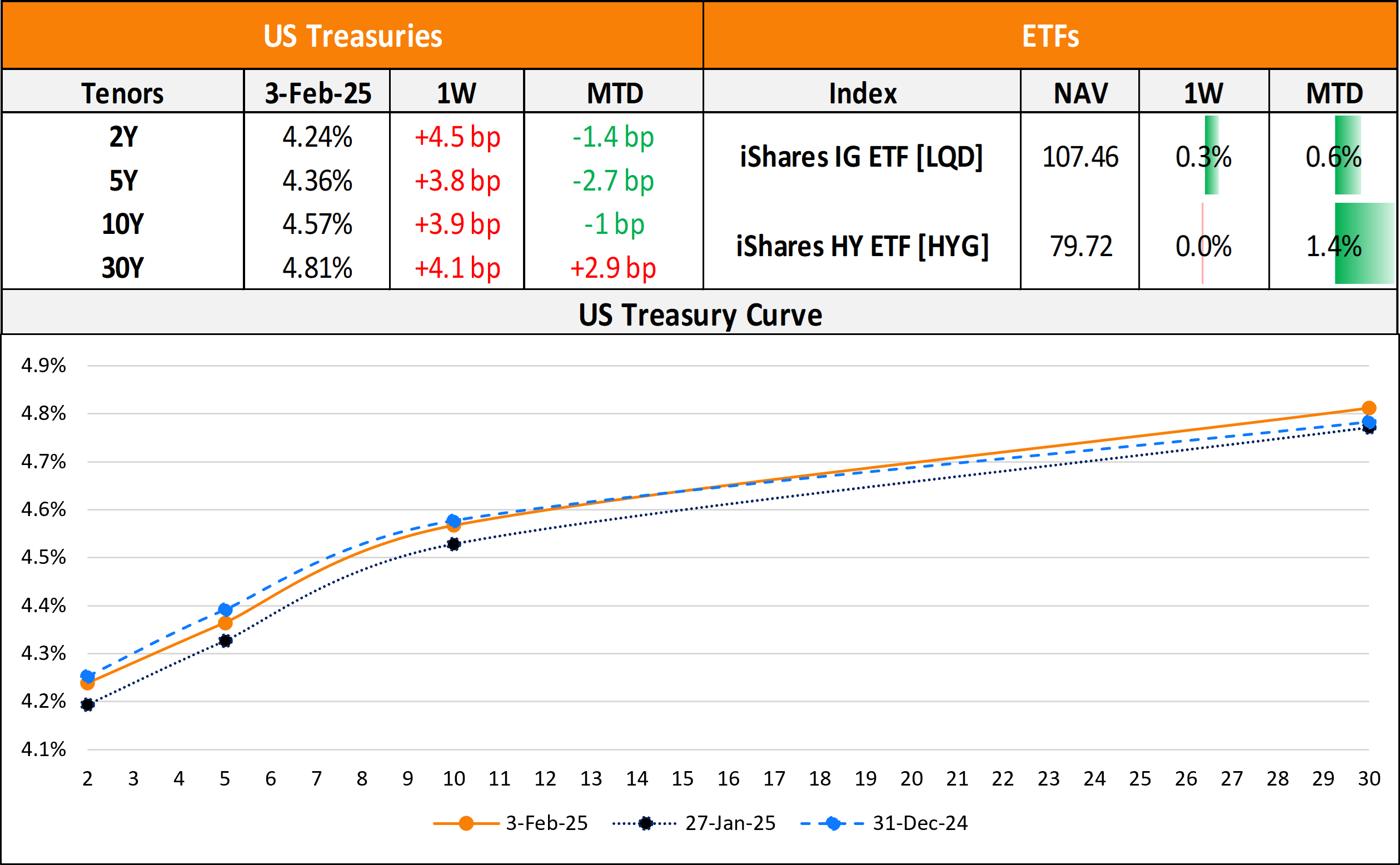 US primary market issuances rose sharply to $40.8bn vs. $15.7bn in the previous week. IG issuers took up $26.9bn of the total, led by Oracle’s $7.75bn six-part offering, followed by NextEra Energy’s $4.25bn four-trancher and American Express’ $3bn three-tranche deal. HY issuances stood at $12.2bn with Quikrete Holdings’ $3.95bn issuance leading the tables, followed by Carnival Corp’s $2bn issuance. In North America, there were a total of 31 upgrades and 18 downgrades each, across the three major rating agencies last week. US IG funds saw $1.3bn in inflows during the week ended January 29, adding to the $915mn inflows seen during the week before that. US HY funds saw $198mn in inflows during the same period, adding to the $1.4bn inflows seen during the week before that.