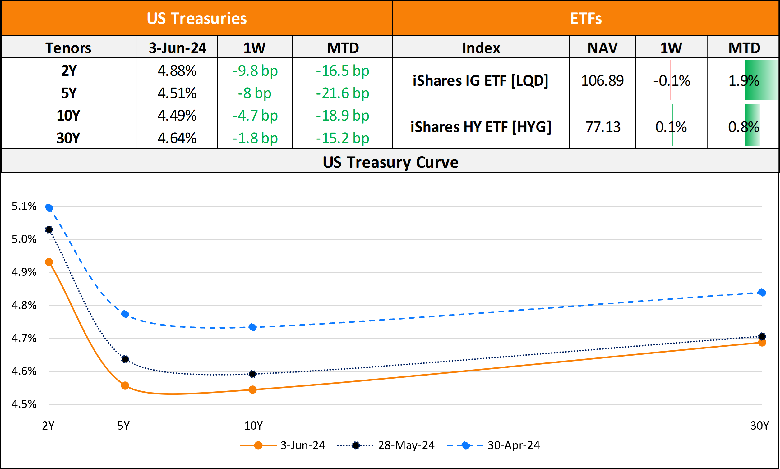 US primary market issuances were muted last week, with new deals at only $13.5bn vs. $35.8bn seen a week before. IG issuers racked up $12.6bn of the total led by Florida Power & Light’s $2.35bn three-trancher and Morgan Stanley Bank’s $2.1bn issuance. HY issuers accounted for only $900mn of the volume with Velocity Vehicle’s $500mn issuance and Alliance Resource’s $400mn deals comprising the total. In North America, there were a total of 58 upgrades and 45 downgrades across the three major rating agencies last week. US IG funds saw a $387.1mn inflow for the week ending May 29, adding to the $701.2mn inflow seen in the week before this. HY funds saw $407.4mn in outflows during the same period, the first outflows in six weeks, after investors added $2.46bn into junk bond funds a week prior.