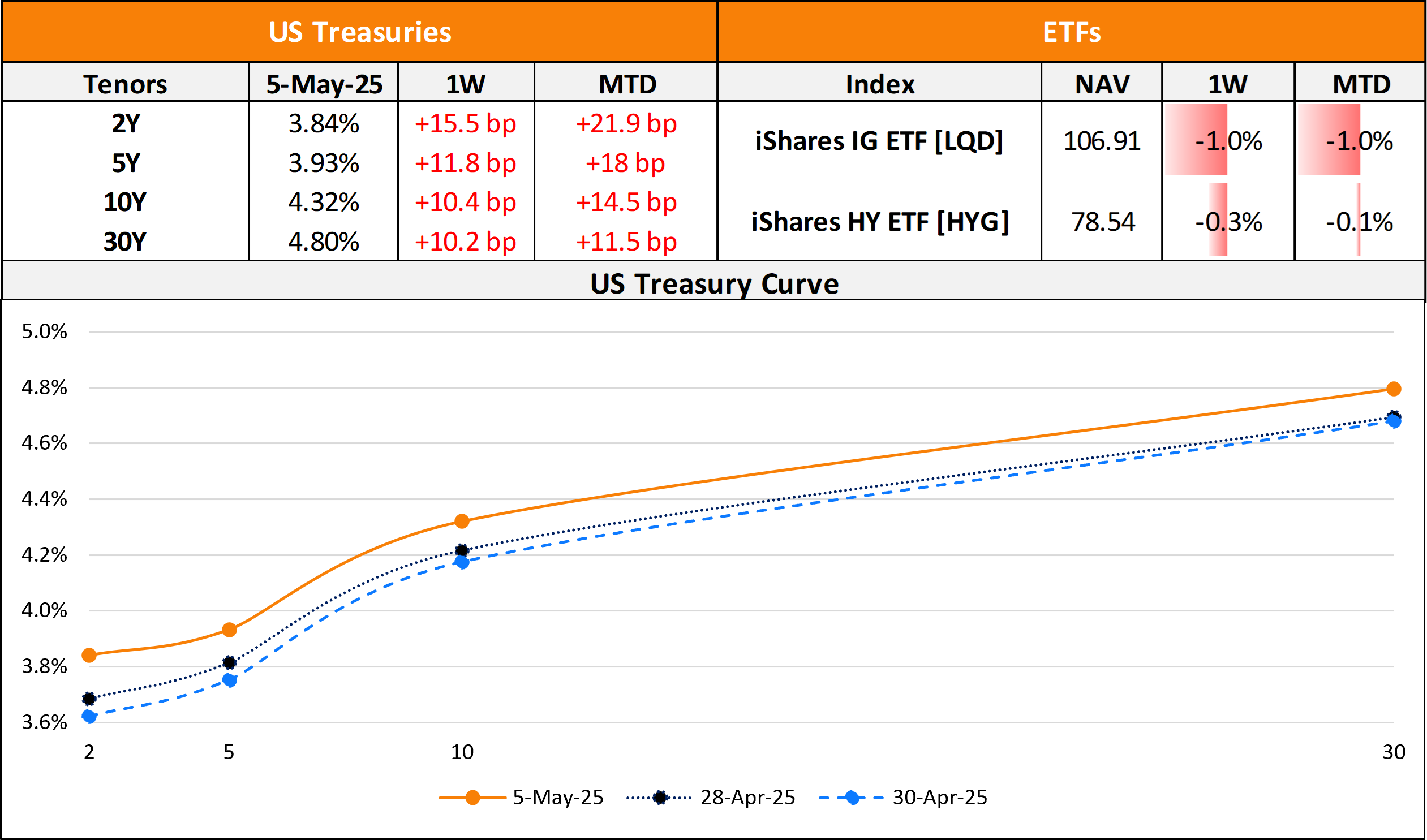 US primary market issuances jumped to $31bn vs. $27.5bn in the previous week. IG issuers took up most of the issuances at $29.4bn, led by Alphabet’s $5bn four-trancher and Citi’s $4.35bn two-part issuance. HY issuances stood at $1.4bn, led by PennyMac’s $850mn issuance and Jefferson Capital’s $500mn deal. In North America, there were a total of 32 upgrades and 33 downgrades each, across the three major rating agencies last week. US IG funds saw $1.5bn in outflows during the week ended April 30, adding to the $1.1bn outflow seen during the week before that. US HY bond funds saw investors pull-out a net $2.6bn, extending the previous week’s outflows of $1.6bn.