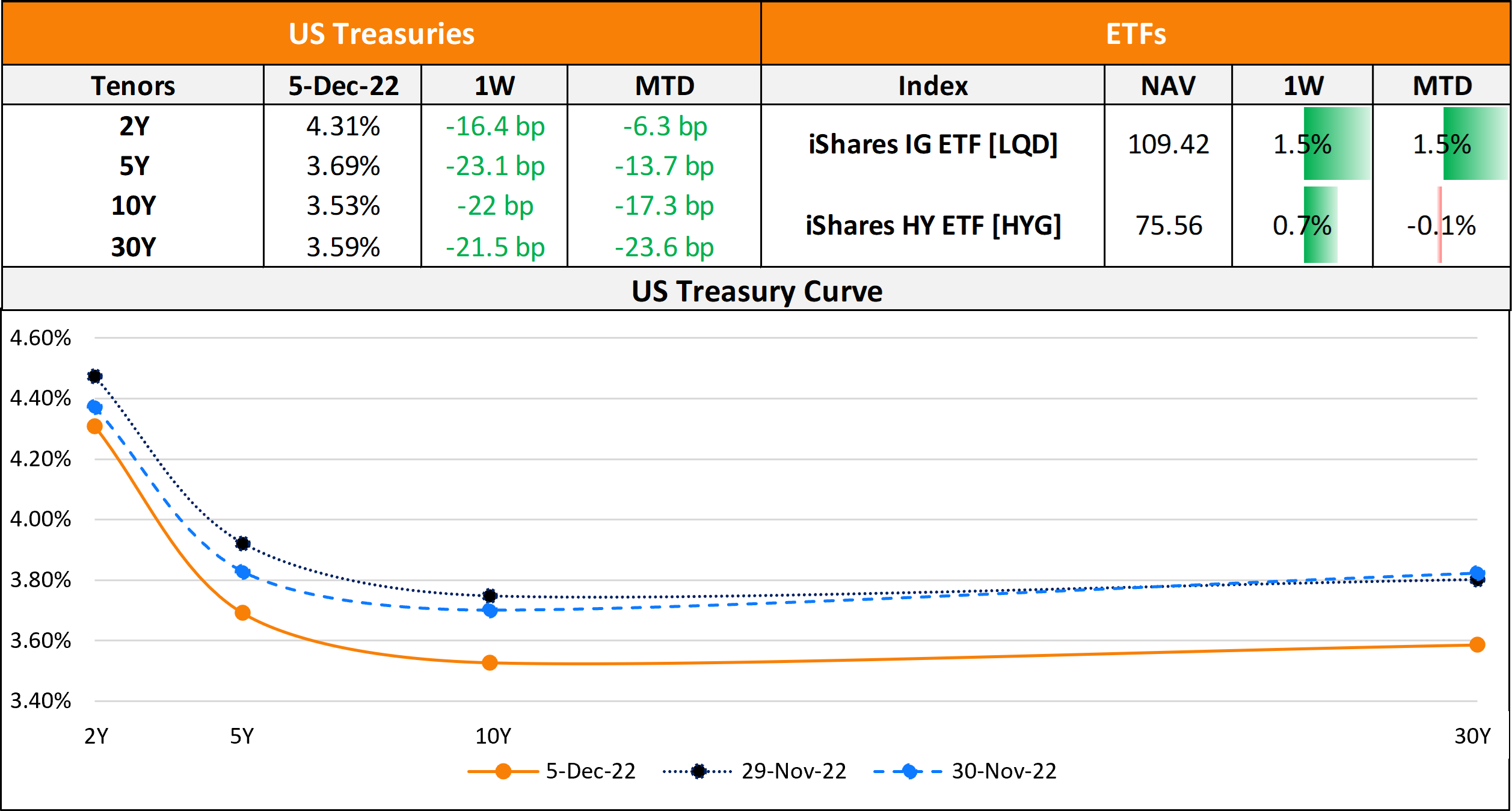 US primary market issuances rose last week to $17.7bn after the week prior to it saw a mere $1.3bn in a shortened week due to Thanksgiving holidays. The deal volumes were solely led by IG issuances stood with Amazon raising $8.5bn via a five-trancher followed by PacificCorp raising $1.25bn. In North America, there were a total of 21 upgrades and 35 downgrades across the three major rating agencies last week. As per Lipper data, US IG funds saw $6.9bn in outflows in the week ended November 30, a fifteenth straight week of outflows while HY funds saw $1.7bn in outflows, breaking a run of five straight weeks of inflows. LatAm saw $1.6bn vs. $357mn in new deals with Colombia raising the entire amount. In South America, there were no upgrades and 2 downgrades across the major rating agencies. EU Corporate G3 issuance stood at $19.7bn vs. $32.1bn a week prior with SocGen raising €1.5bn followed by EDF and Commerzbank raising €1bn each. Across the European region, there were 16 upgrades and 37 downgrades. The GCC G3 primary bond market saw $355mn vs. $750mn in deals in the prior week led with HSBC Bank Middle East raising $350mn. Across the Middle East/Africa region, there were 6 upgrades and 9 downgrades each across the three major rating agencies. APAC ex-Japan G3 issuances were at $5.8bn vs. $2.3bn in the week prior led by ANZ Bank’s $2.5bn dual-trancher, Commonwealth Bank’s $1.5bn and Deyang Development’s $700mn two-trancher. In the APAC region, there were 6 upgrades and 11 downgrades combined across the three rating agencies last week.