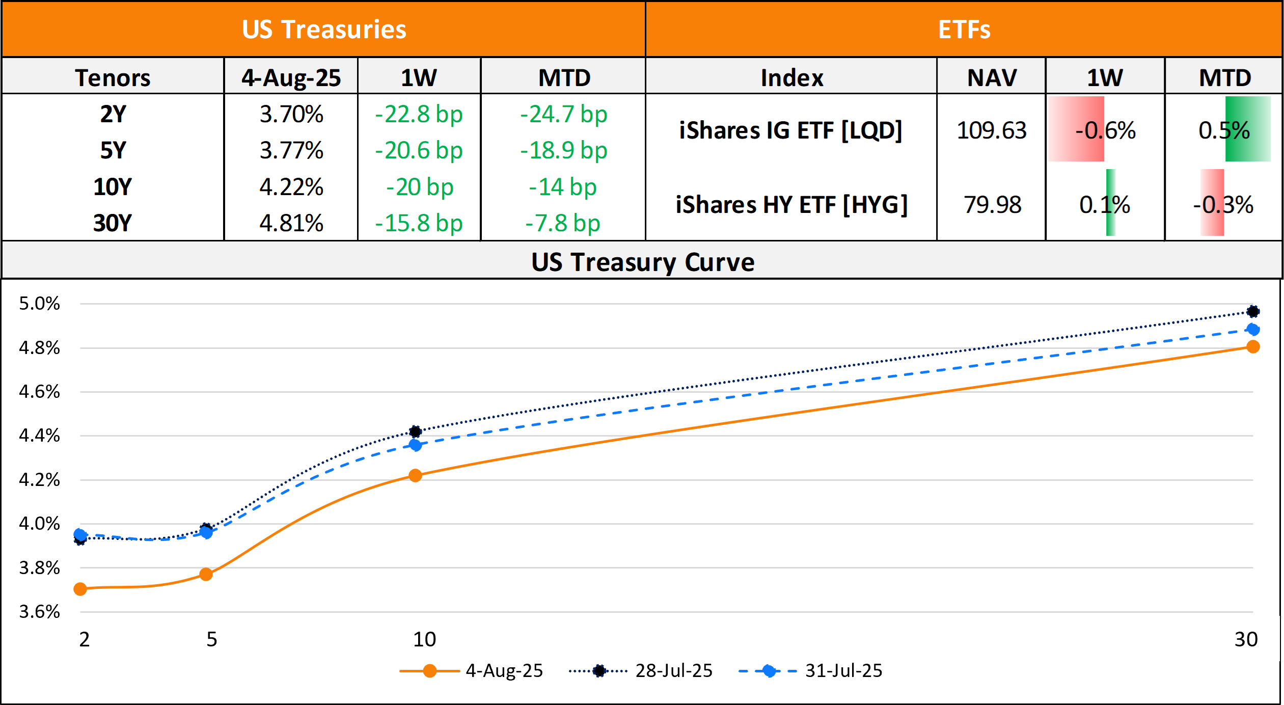 US primary market issuances fell to only $14.4bn vs. $33.9bn in the prior week. IG issuers took up $7.6bn of the total, led by NextEra Energy’s $2bn issuance and Sherwin-Williams’ $1.5bn three-part issuance. HY issuances stood at $6.6bn, led by Advance Auto Parts’ $1.95bn two-part deal and CHS’ $1.79bn issuance. In North America, there were a total of 26 upgrades and 49 downgrades each, across the three major rating agencies last week. US IG funds saw $1.3bn in inflows during the week ended July 30, adding to the $1.7bn inflows seen during the week before that. US HY bond funds saw $167mn of outflows, reversing the $910mn inflows in the prior week.