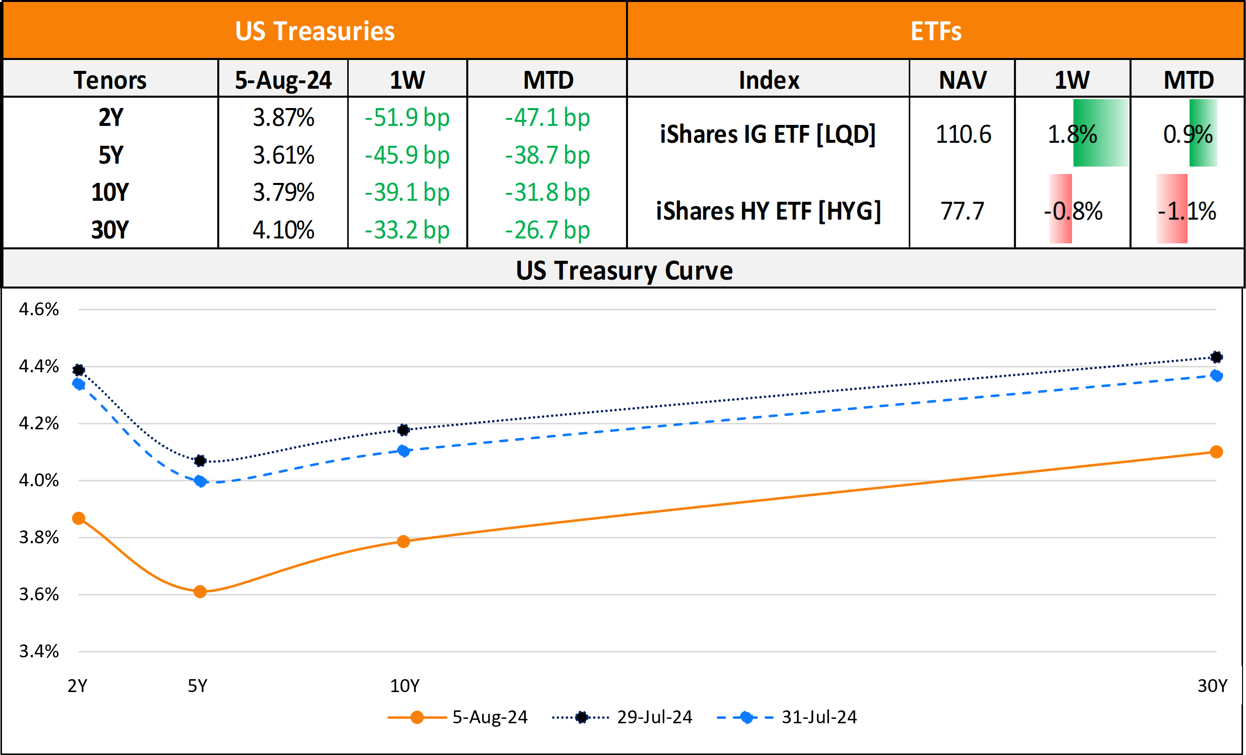 US primary market issuances stood at $35.9bn last week vs. $36.9bn in the week prior to it. IG issuers took up $26.5bn of the total, led by Citibank NA’s $4bn three-part deal and Netflix’s $1.8bn two-tranche deal. HY issuers accounted for $9.1bn of the volume with Royal Caribbean’s $2bn and RR Donnelley’s $1.05bn deals each leading the tables. In North America, there were a total of 40 upgrades and 24 downgrades across the three major rating agencies last week. US IG funds saw $1.79bn of inflows for the week ending July 31 and compared to outflows of $196mn in the week prior to it. HY funds saw $438mn in inflows, adding to the $1.52bn inflows seen a week before this.