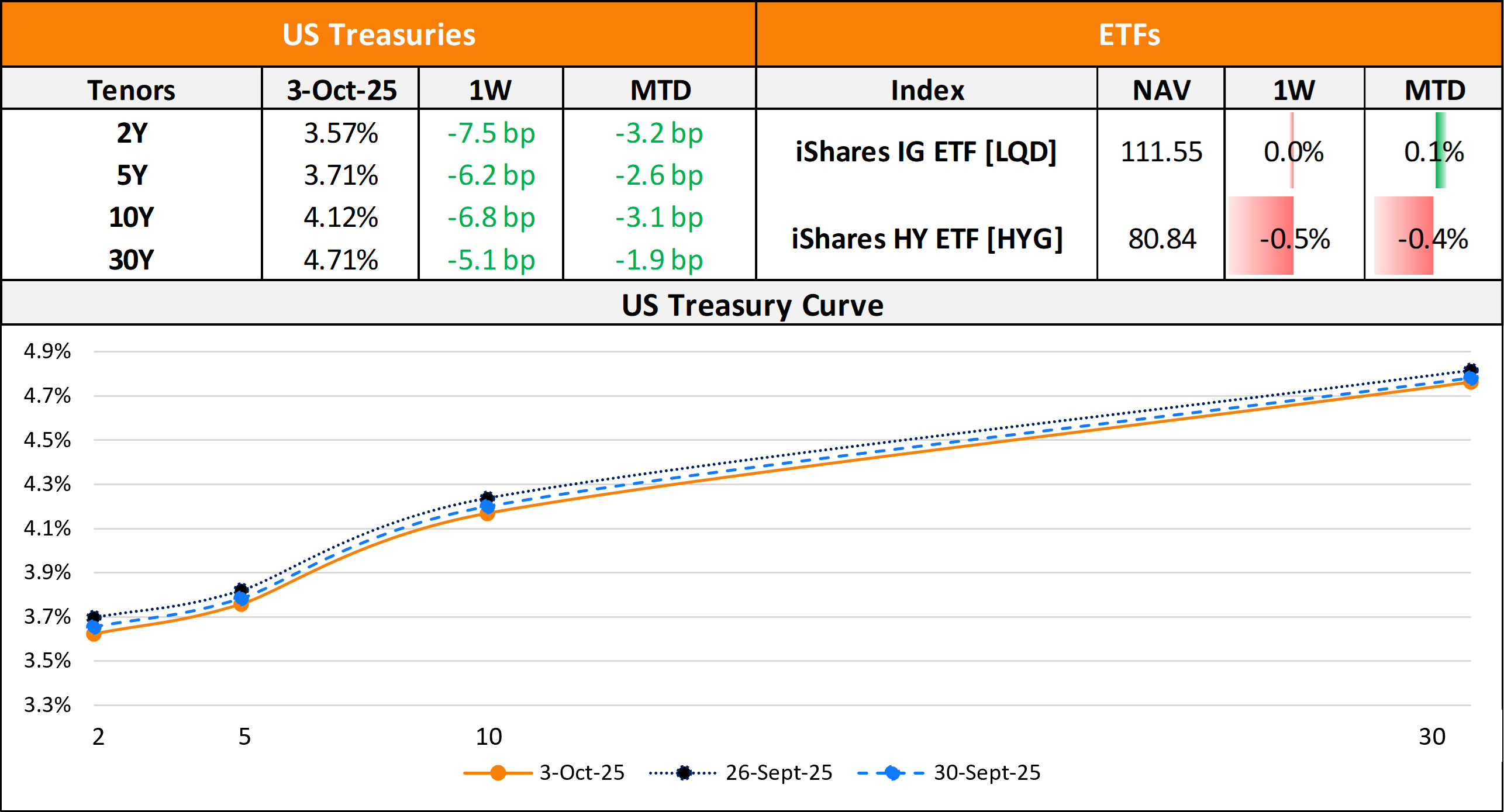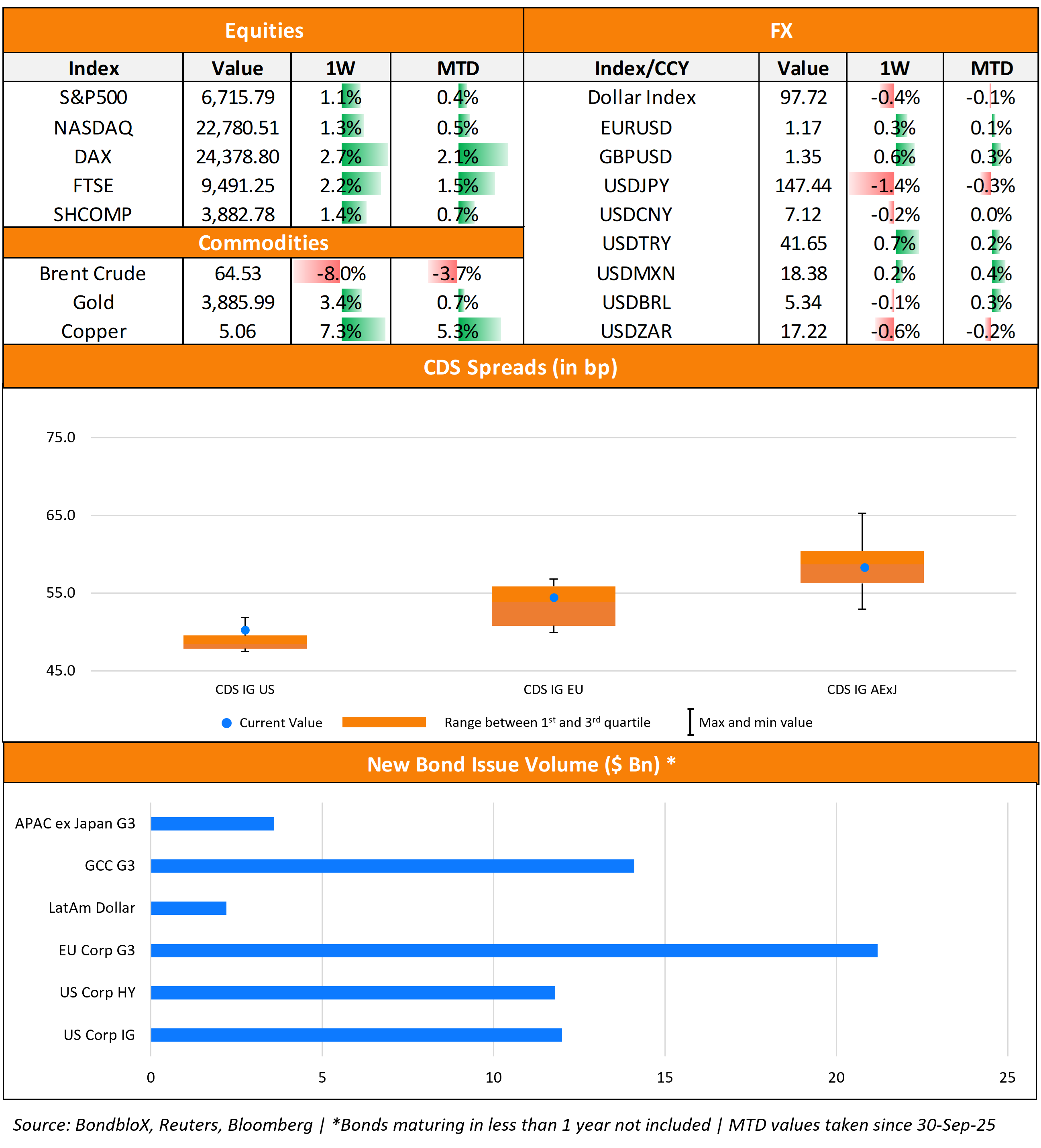 US primary market issuances fell last week to $27.4bn vs. $63.3bn in new deals seen a week prior to it. IG issuers took up $12bn of the total, led by Thermo Fisher’s $2.5bn four-trancher, followed by $2bn three-tranche deals by PG&E and Vistra Corp each. HY deals stood at $11.8bn, led by Viking Holdings’ $1.7bn issuance and ION Platform Investment Group’s $1.5bn issuance. In North America, there were a total of 50 upgrades and 43 downgrades, across the three major rating agencies last week. US IG funds saw $1.8bn in inflows during the week ended October 1, similar to the $1.8bn inflows seen during the week before that. US HY bond funds saw $1.2bn in inflows, reversing the $354mn outflows seen in the prior week.