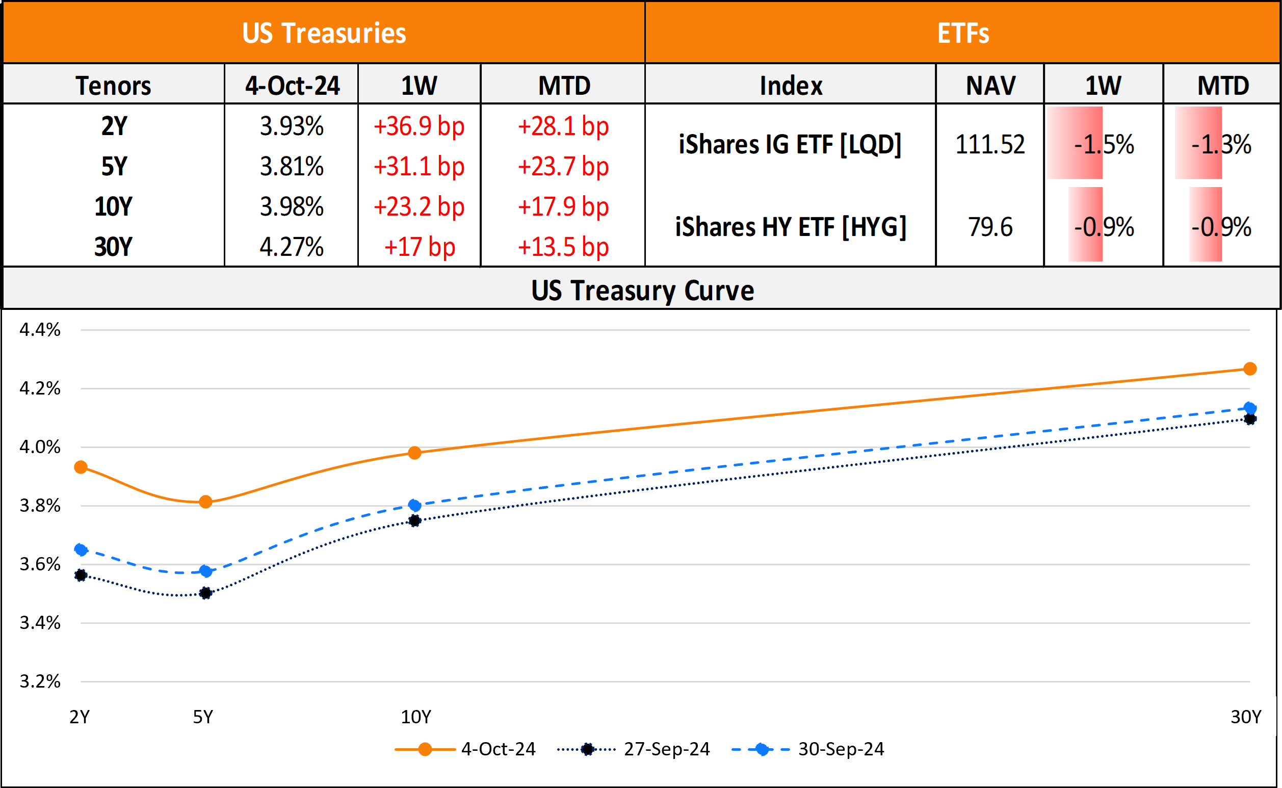 US primary market issuances fell last week to $20.3bn vs. $35bn seen in the prior week. IG issuers took up $14.8bn of the total, led by Accenture’s $5bn four-trancher and Dell’s $1.5bn two-trancher. Last week saw $5.1bn in HY issuances from the region, led by Caesars Entertainment’s $1.1bn deal and Hillcorp Energy’s $1bn issuance. In North America, there were a total of 86 upgrades and 31 downgrades across the three major rating agencies last week. US IG funds saw $3.8bn of inflows last week, adding to the $1.34bn of inflows during the week before that. HY funds saw $2.2bn of inflows during the same period adding to the $541mn of inflows in the week prior to it.