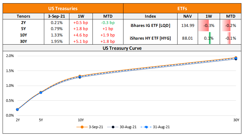 US primary market issuances dropped for another week to $2bn vs. $2.3bn in the week prior. IG issuances fell to $1bn vs. $1.9bn in the prior week. HY issuances were marginally higher at $527mn vs. $400mn in the prior week. The IG space saw only one deal, by Verizon worth $1bn. In the HY space, College Holdings II raised $500mn. In North America, there were a total of 35 upgrades and 16 downgrades combined across the three major rating agencies last week. LatAm saw $133mn in issuance last week vs. $168mn in the week before with Banco de Credito e Inversiones being the sole issuer. EU Corporate G3 issuances dropped slightly to $19.9bn vs. $21.2bn in the week prior led by Allianz’s ~$2.4bn dual-currency offering and Skandinaviska Enskilda’s $1.27bn dual-trancher. Across the European region, there were 25 upgrades and 10 downgrades across the three major rating agencies. GCC G3 issuances stood at $600mn vs. $85mn in the week before with AUB Sukuk Ltd. being the lone issuer. Across the Middle East/Africa region, there were no upgrades or downgrades across the three major rating agencies. APAC ex-Japan G3 issuances rose to $6.84bn vs. $2.6bn in the prior week – State Grid Overseas Investments raised $1.55bn via a dual-currency EUR/USD offering followed by AIA Group’s €750mn issuance, Adani Green Energy’s $750mn deal and Axis Bank’s $600mn PerpNC5 AT1 sustainable bond issue, the first ever sustainable issuance from an Indian bank. In the Asia ex-Japan region, there were 5 upgrades and 20 downgrades combined across the three major rating agencies last week.