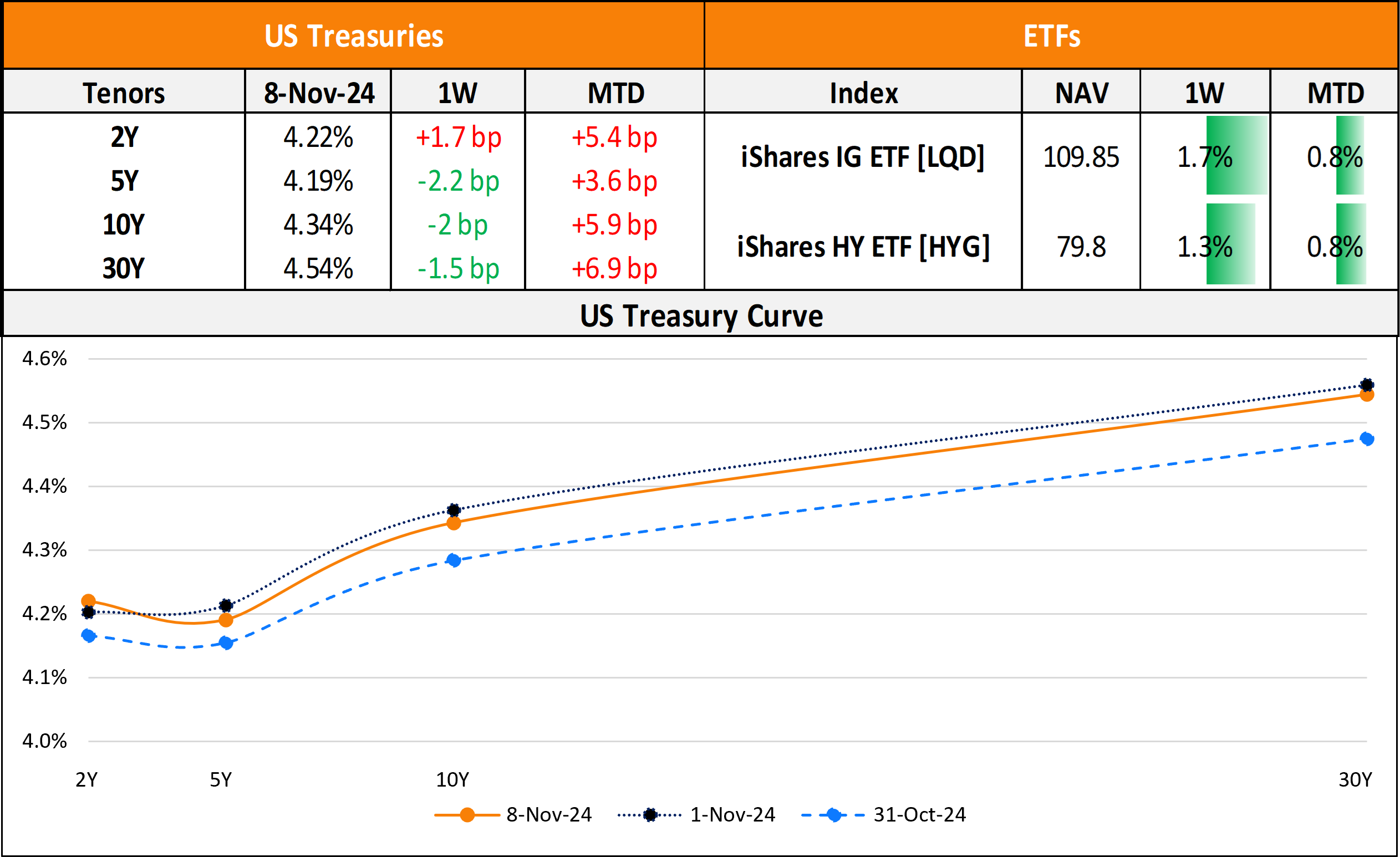 US primary market issuances dropped significantly last week to only $2.5bn vs. $27.4bn seen in the week prior to it, primarily on the back of the US Presidential election and the FOMC meeting a day later. IG issuers took up $1.7bn of the total, led by Athene’s $650mn deal, Oncor Electric’s $500mn deal and Reliance Standard Life’s $400mn issuance. Last week saw $500mn in HY issuances from the region, with a solo issuance by Visant Corp. In North America, there were a total of 26 upgrades and 32 downgrades across the three major rating agencies last week. US IG funds saw $3.3bn of inflows last week, adding to the $3.2bn inflows during the week before that. HY funds witnessed a net $455mn in inflows during the same period, reversing the $811mn of outflows in the week prior to it.