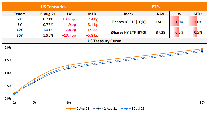 US primary market issuances rose to $34.5bn vs. $28.9bn in the week prior. IG issuances rose marginally to $21.9bn vs. $20.2bn in the prior week while HY issuances picked up to $11.5bn vs. $7.7bn in the prior week. The IG space was led by Amgen’s $5bn four-part issuance and Raytheon’s $2bn dual-trancher. In the HY space, Sirius XM Radio’s $2.5bn dual-trancher and CCO Holdings’ $2bn deal led the tables. In North America, there were a total of 74 upgrades and 15 downgrades combined across the three major rating agencies last week. LatAm saw $2.1bn vs. $1.3bn in issuances in the prior week led by Aeropuerto’s $1.85bn dual-trancher and Gran Columbia’s $300mn deals. EU Corporate G3 issuances rose sharply to $19.3bn vs. $2.3bn and $13.6bn in the weeks prior – Credit Suisse’s $3.5bn and Volkswagen’s $2.5bn two-tranchers led the tables. Across the European region, there were 23 upgrades and 21 downgrades across the three major rating agencies. The GCC and Sukuk region saw no new bond issuances last week vs. $150mn in the week prior. Across the Middle East/Africa region, there was 1 upgrades and 52 downgrades across the three major rating agencies. APAC ex-Japan G3 issuances fell to $3.8bn from $5.96bn in the prior week – BOC HK raised $2bn via a dual-trancher, leading the table followed by Ping An Insurance’s $550mn deal and India’s Summit Digitel’s $500mn issuance. Other issuances from the region included Gemdale’s $480mn deal, Kasikornbank’s $350mn deal and Korea Midland Power’s $300mn issuance. In the Asia ex-Japan region, there were 9 upgrades and 13 downgrades combined across the three major rating agencies last week.