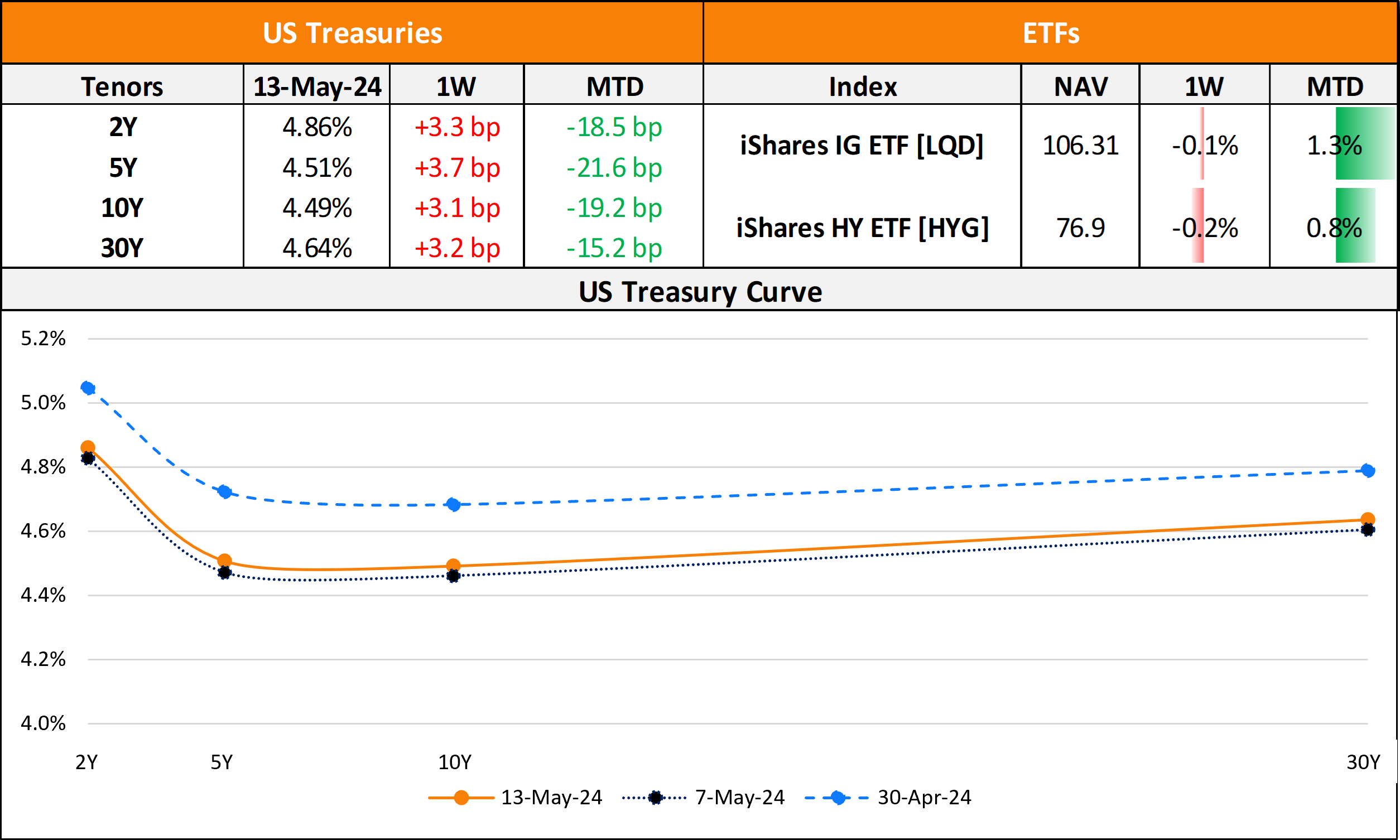 US primary markets were muted last week, with new deals at $55.7bn vs. $20.5bn seen a week before. IG issuers racked up $40.7bn of the total led by CVS Health’s $5bn five-trancher and Charter Communications’ $3bn two-trancher. HY issuers accounted for $15.3bn of the volume with Block Inc. raising $2bn and Cloud Software’s $1.8bn leading the tables. In North America, there were a total of 61 upgrades and 55 downgrades across the three major rating agencies last week. US IG funds saw inflows of $931mn for the week ending May 8, adding to the $811.6mn inflows seen the week before this. HY funds saw a $392mn in inflows during the same period, after investors added $197mn into junk bond funds a week prior.