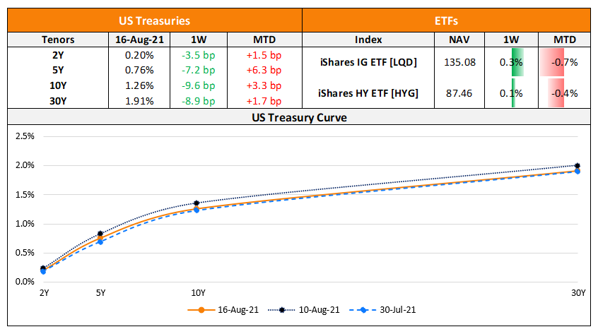 US primary market issuances rose to $46.6bn vs. $34.5bn in the week prior. IG issuances rose to $32.1bn vs. $21.9bn in the prior week and HY issuances were also higher at $14.4bn vs. $11.5bn in the prior week. The IG space was led by Intel’s $4bn four-part deal, T-Mobile’s $2.7bn issuance and Thermo Fisher’s $2.4bn dual-trancher. In the HY space, Uber’s $1.5bn issuance led the table followed by CommScope and WR Grace Holdings raising $1.25bn and $1.16bn respectively. In North America, there were a total of 38 upgrades and 20 downgrades combined across the three major rating agencies last week. LatAm saw no issuances last week as compared to $2.1bn in the prior week. EU Corporate G3 issuances dropped by half to $8.9bn vs. $19.3bn in the week prior – HSBC’s $3.5bn dual-trancher, BMW’s $2.5bn four-trancher and StanChart’s $1.5bn PerpNC7 led the tables. Across the European region, there were 10 upgrades and 5 downgrades across the three major rating agencies. The GCC saw saw just one G3 deal – a $200mn issuance by Abu Dhabi Commercial Bank (ADCB) last week as compared to no issuances in the week before that. Across the Middle East/Africa region, there was 1 upgrade and 1 downgrade across the three major rating agencies. APAC ex-Japan G3 issuances fell to $2.6bn vs. $3.8bn in the prior week – Shaoxing City Investment Group raised $700mn, followed by Azure Power raising $414mn and Sichuan Development raising $400mn. Issuance volumes in the region have dropped significantly MTD in August to only $6.4bn as compared to July that saw $19.9bn in deals by mid-month. In the Asia ex-Japan region, there were 14 upgrades and 5 downgrades combined across the three major rating agencies last week.
