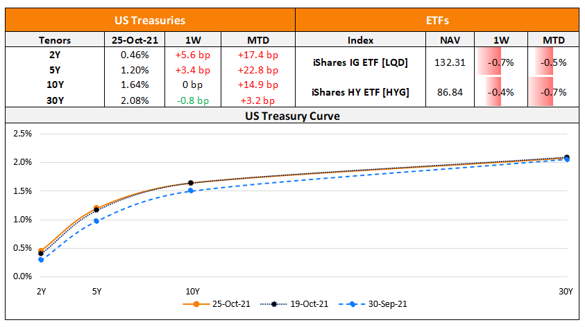The US 2s10s yield curve flattened ~6bp last week with the rising inflation theme picking up as the short-end of the curve saw yields pick-up. US primary markets saw an decrease in issuances to $28.2bn vs. $18.3bn in the prior week. IG issuances rose almost 2x to $20bn vs. $10.9bn in the prior week while HY issuances rose marginally to $7.7bn vs. $7bn in the prior week. The largest deals in IG space were led by big banks with Goldman Sachs’ $9bn five-trancher, US Bancorp’s $1.5bn deal and BofA and Morgan Stanley’s $1.3bn deals. In the HY space, Carnival Corp raised $2bn followed by Lamb Weston Holdings’ $1.67bn dual-trancher leading the table. In North America, there were a total of 23 upgrades and 5 downgrades combined across the three major rating agencies last week. LatAm saw $1.4bn in issuances vs. $3.5bn in the week prior with Corp Nacionale del Cobre de Chile raising $780mn and Banco Santander Chile raising $500mn respectively. In South America, there were 3 upgrades and 8 downgrades each combined across the major rating agencies. EU Corporate G3 issuances saw a sharp rise to $36.9bn vs. $25.2bn in the week prior with AerCap alone issuing $21bn of bonds via a nine-part deal to help fund its acquisition of GE Capital Aviation Services. AerCap’s issuance was the second biggest issue of the year, after Verizon’s $25bn offering in March. Across the European region, there were 17 upgrades and 5 downgrades across the three major rating agencies. The GCC G3 saw no issuances for a second consecutive week. Across the Middle East/Africa region, there were no upgrades and 5 downgrades across the three major rating agencies. APAC ex-Japan G3 issuances saw a sharp increase to $19bn vs. $6.2bn in the week before. The largest deals were led by TSMC’s $4.5bn and Chinese Sovereign’s $4bn four-tranchers respectively, followed by ICBC’s $3.23 multi-currency carbon neutrality themed bond deal and Korea Development Bank’s $1.2b dual-trancher. In the Asia ex-Japan region, there were 5 upgrades and 11 downgrades combined across the three major rating agencies last week.