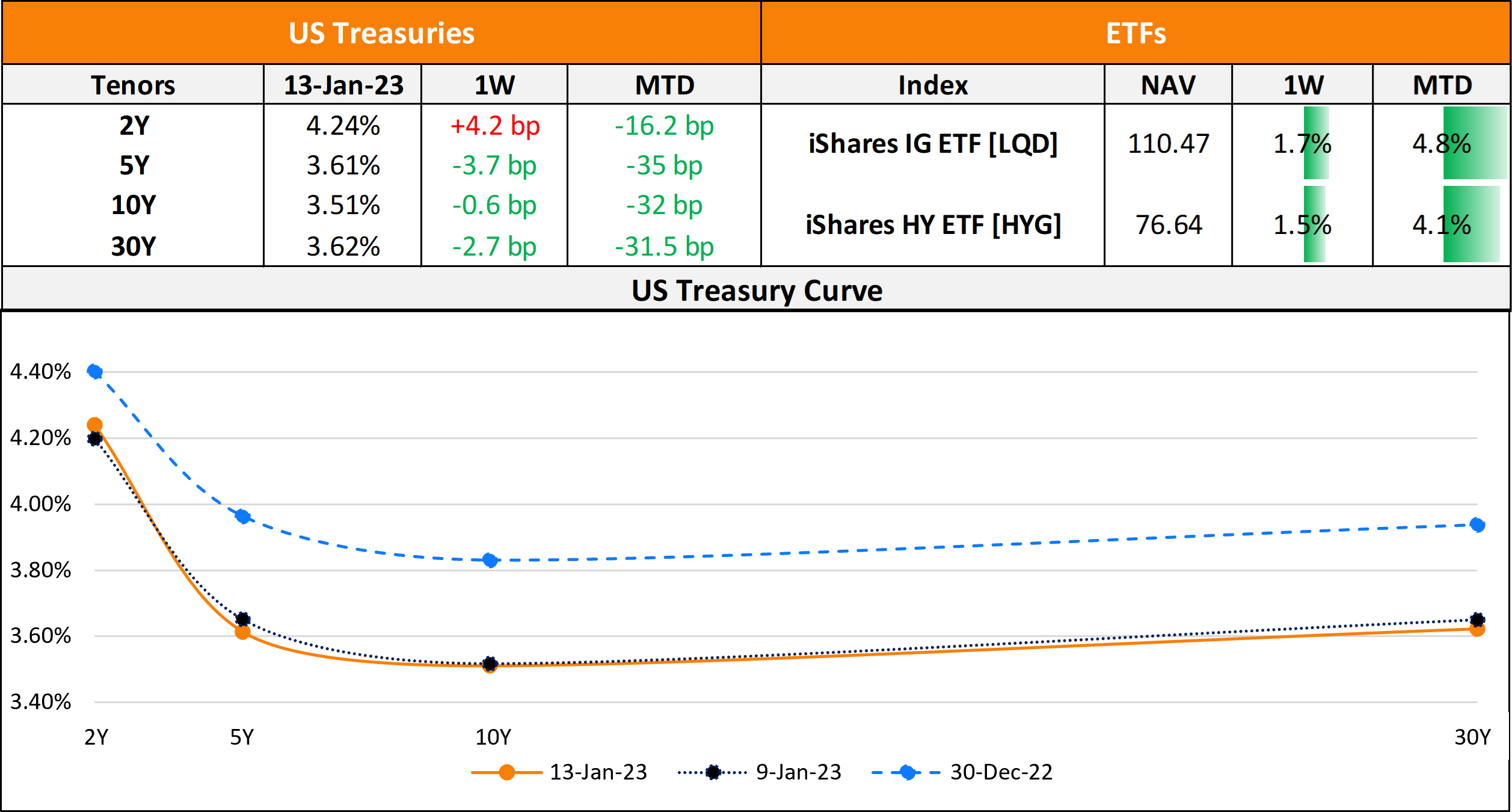 US primary market issuances stood at $17.6bn last week vs. $23.6bn a week prior. IG issuances stood at $15.7bn led by Regal Rexnord’s $4.75bn four-trancher and Toyota’s $3bn four-trancher. HY issuances stood at $1.8bn with Venture Global Calcasieu raising $1bn and Transocean raising $525mn. In North America, there were a total of 9 upgrades and 26 downgrades across the three major rating agencies last week. As per Lipper data, US corporate bond funds saw $9.1bn in inflows for the week ended January 11. IG funds snapped a three-week losing streak as they saw $6.6bn in inflows, its biggest since 20 January 2021. HY funds also saw inflows of $2.51bn after a $2.2bn outflow in the prior week.