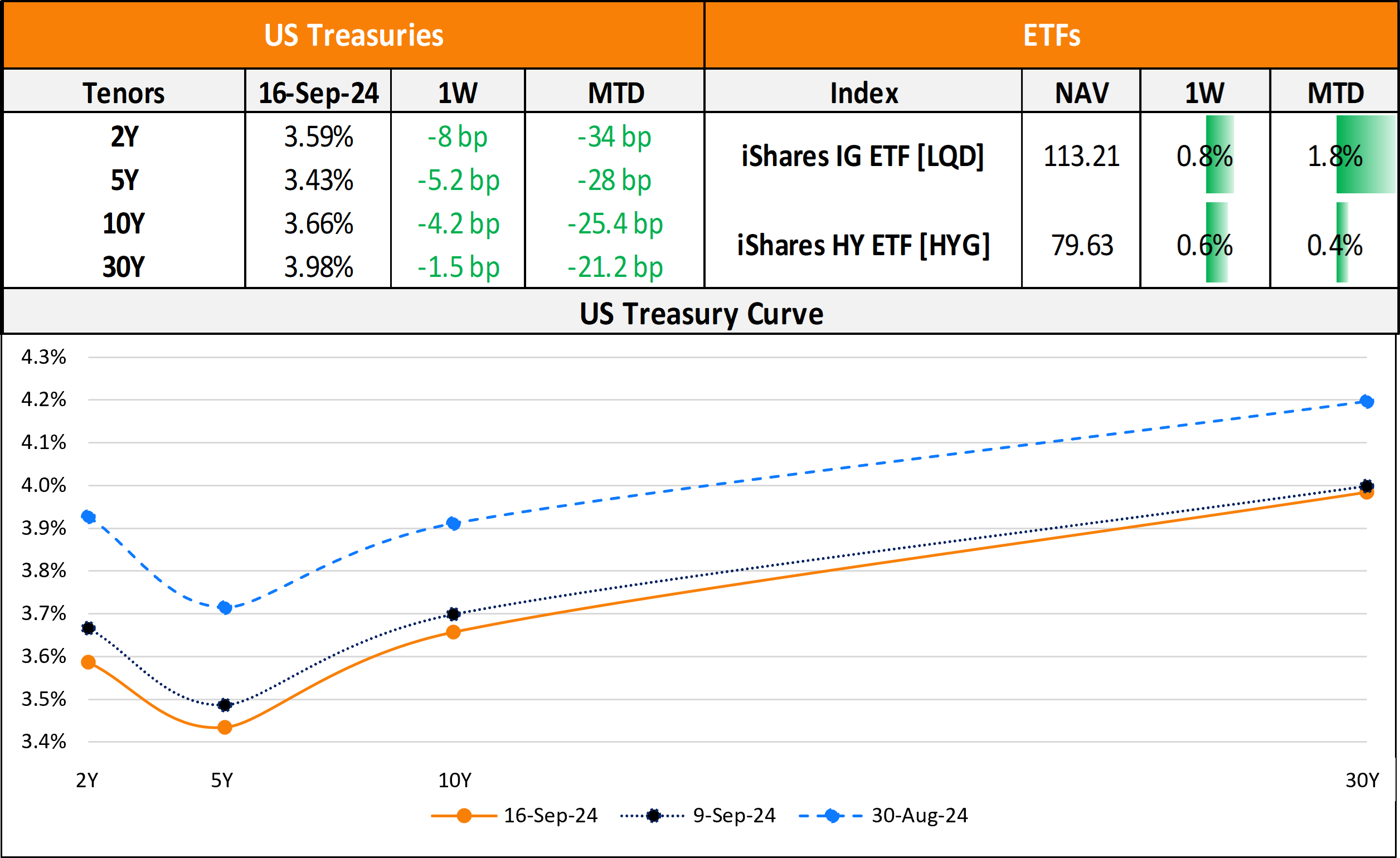 US primary market issuances dropped marginally to $45.3bn vs. $49.1bn in the week prior to it. IG issuers took up $35.2bn of the total, led by HPE’s $9bn and ONEOK’s $7bn six-part offerings each, and Citigroup’s $4.1bn two-trancher. Last week saw $10.1bn in HY issuances from the region, led by Alliant’s $1.7bn and Perrigo’s $1.4bn two-part offerings each. In North America, there were a total of 31 upgrades and 30 downgrades across the three major rating agencies last week. US IG funds saw $1.84bn of inflows for the week ending September 11, adding to inflows of $1.46bn in the week prior to it. HY funds saw $632.7mn of inflows reversing the marginal $2.97mn in outflows in the week before this.