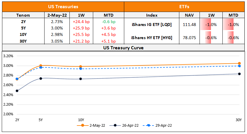 US primary market issuances dropped significantly to $11.5bn vs. $47.9bn in the week prior with Investment grade (IG) corporates issuing $8.2bn of deals while high yield (HY) issuances were at $3.28bn. The largest IG deals included American Express raising $3.5bn via a three-trancher and Anthem Inc raising $1.3bn via a two-trancher. In the HY space, Carvana was the sole issuer. In North America, there were a total of 34 upgrades and 21 downgrades combined across the three major rating agencies last week. LatAm saw $500mn in issuances last week vs. $882mn in the prior week, with Aegea Finance being the sole issuer. In South America, there were 8 upgrades and 5 downgrades across the major rating agencies. EU Corporate G3 issuances stood at $23.5bn vs. $11.3bn in the week prior, led by KfW raising €3bn, Banco Santander raising €2bn and SocGen’s €3bn two-trancher. Across the European region, there were 12 upgrades and 17 downgrades across the three major rating agencies. The GCC G3 region saw no new deals last week. Across the Middle East/Africa region, there were 3 upgrades and 10 downgrades across the three major rating agencies. APAC ex-Japan G3 issuances stood at $5.7bn vs. $12.8bn in the week before. This was led by Mineral Resources’ $1.25bn two-trancher, Mumbai Airport’s $750mn issuance and ST Engineering’s $700mn deal. In the APAC region, there were 6 upgrades and 16 downgrades combined across the three major rating agencies last week.