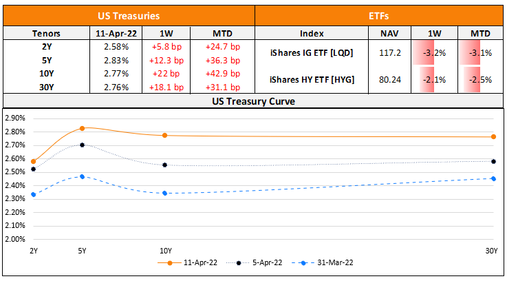 US primary market issuances fell to $17.7bn vs. $25bn in the week prior. Investment grade (IG) corporates took the chunk of issuances, with $13.6bn of deals while high yield (HY) issuance stood at $3.9bn. The largest IG deals were led by Take Two’s $2.7bn four-trancher and GM’s $2.5bn three-trancher. In the HY space, Hillcorp’s Energy $1.5bn three-trancher and Earthsone’s $550mn deals. In North America, there were a total of 30 upgrades and 12 downgrades combined across the three major rating agencies last week. LatAm saw $1.1bn in issuances last week with Fondo Mivivienda and Consorcio Transmantaro’s $600mn and $500mn deals, as compared to $1bn in the prior week. In South America, there was 2 upgrades and 3 downgrades across the major rating agencies. EU Corporate G3 issuances stood at $16.3bn vs. $31.4bn in the week prior, led by Credit Suisse’s $2.5bn dual-trancher and Diageo Capital’s €1.55bn two-trancher. Across the European region, there were 9 upgrades and 26 downgrades across the three major rating agencies. The GCC G3 region saw nil issuance vs. $1.3bn in issuances in the week before. Across the Middle East/Africa region, there were 2 upgrades and 9 downgrades across the three major rating agencies. APAC ex-Japan G3 issuances stood at $7.5bn vs. $7.9bn in the week before. This was led by Freeport Indonesia’s $3bn three-trancher and Fortescue Metals Group’s $1.5bn two-part issuance. In the APAC region, there was 1 upgrades and 7 downgrades combined across the three major rating agencies last week.