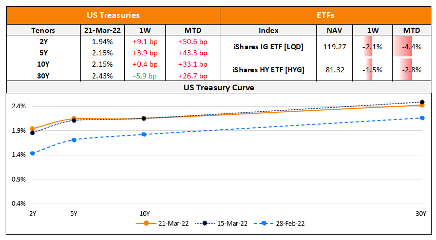The yield curve continues to flatten further – the 2s10s has now flattened from 38bp in the beginning of the month to 15bp currently. US primary market issuances rose to $32bn vs. $18.5bn in the week prior. Investment grade (IG) corporates once again took the chunk of issuances, with $26.6bn of deals while high yield (HY) issuance stood at $4.3bn. The largest IG deals were led by GSK Consumer Healthcare $8.75bn seven-part offering, and Home Depot’s $4bn four-trancher. In the HY space, Ford Motor’s $1.5bn issuance, followed by Paramount Global and Yum Brands’ $1bn deal each. In North America, there were a total of 20 upgrades and 14 downgrades combined across the three major rating agencies last week. LatAm saw no issuances last week as compared to $762mn in the prior week. In South America, there was no upgrades and 9 downgrades across the major rating agencies. EU Corporate G3 issuances stood at $47bn vs. $31.4bn in the week prior, led by the ING’s $4bn four-trancher, KfW’s €2bn deal and HSBC’s $2bn issuance. Across the European region, there were 65 upgrades and 20 downgrades across the three major rating agencies. The GCC G3 region saw $3bn vs. $100mn in issuances in the week, led by MDGH’s $1.5bn issuance, followed by ADCB and Boubyan’s $500mn deals each. Across the Middle East/Africa region, there were 3 upgrades and no downgrades across the three major rating agencies. APAC ex-Japan G3 issuances stood at $8.6bn vs. $5.96bn led by Philippines‘ $2.25bn triple-trancher, Indonesia’s $1.75bn dual-trancher and PTT Global Chemicals’ $1.3bn two-trancher, . In the APAC region, there were 2 upgrades and 13 downgrades combined across the three major rating agencies last week.