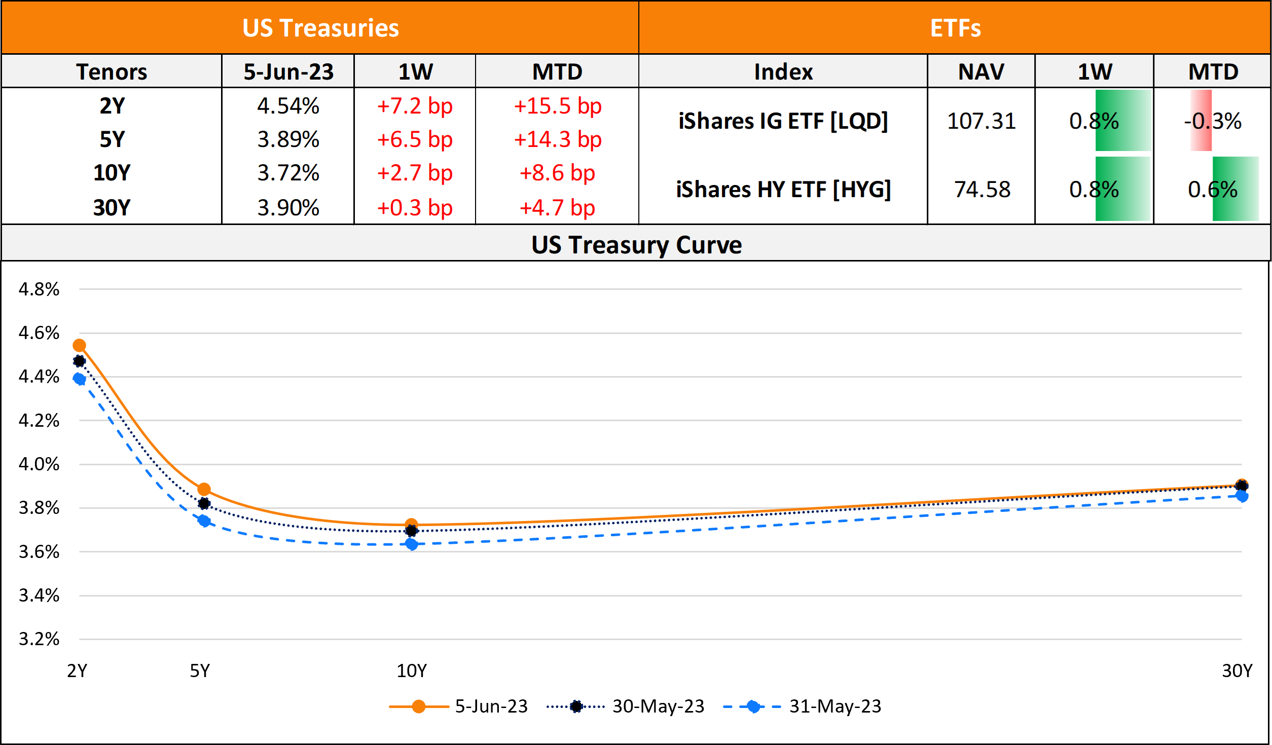 EU Corporate G3 issuance was also lower at $28.9bn vs. $41.4bn a week prior. Issuance volumes were led by SocGen’s €2.25bn and Landesbank’s €1.5bn two-tranche deals. Across the European region, there were 26 upgrades and 25 downgrades. The GCC dollar primary bond market saw $620mn in new deals led by FAB’s issuance, following $1.4bn in deals a week prior. Across the Middle East/Africa region, there were 3 upgrades and no downgrades across the major rating agencies. LatAm saw no new deals for a fifth consecutive week. The South American region saw no upgrades and 7 downgrades across the rating agencies.
