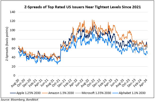 Credit spreads of the highest rated US corporate issuers, as measured by the z-spread, are at its tightest levels since 2021 where the pandemic situation eased, alongside massive stimulus by the government and the central bank. With the current levels, especially in bonds that are due to mature in the next 2 years, z-spreads are trading almost flat to the comparable US Treasury yield. Analysts note that at the current levels, these bonds are trading as an alternative to US Treasuries. Rich Familetti, CIO of US total return fixed income at SLC Management said, “That’s possible only because of the demand for credit… Normally at this level of credit spreads, we would reduce our corporate credit exposure… (however now) willing to remain more invested than we would normally”. As seen in the chart below, bonds of top US issuers like Apple, Amazon, Microsoft and Alphabet that mature in 2030 have been trending lower since mid-2022 and are currently at 45-60bp, close to its tightest levels seen in 2021 that stood at 25-40bp.