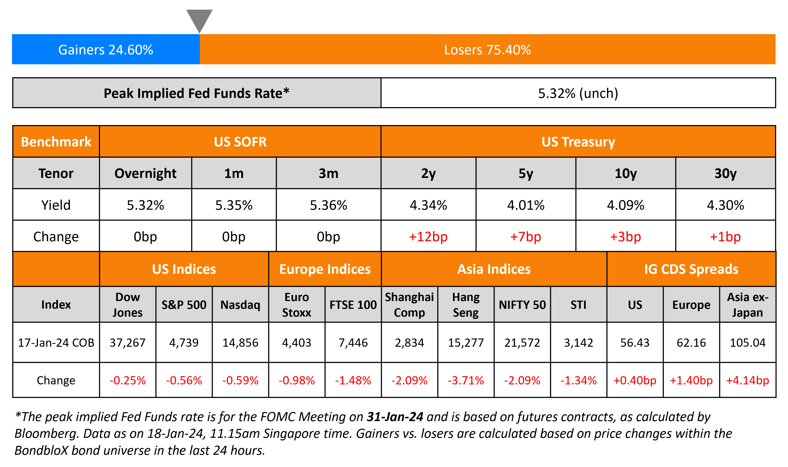 US Treasury yields jumped further higher, led by the front-end, as strength in economic data saw markets reprice their view on expected Fed rate cuts. The 2Y yield rose by 12bp and the 10Y was up 3bp. US Retail Sales rose by more than expected in December, thanks to an increase in motor vehicles and online purchases. Retail sales increased 0.6% MoM vs. estimates of 0.4% and the previous 0.3% print. Core retail sales rose 0.4%, above estimates and the prior 0.2%. On a YoY basis, it rose 5.6% vs. estimates of %. The control group sales, used to calculate GDP, advanced 0.8%, the most since July, above estimates of 0.2% and prior month’s 0.4%. Also, US Industrial Production and Manufacturing Output rose 0.1% in December. Following this, markets have priced-out 15bp in rate cuts as seen by the Fed Funds Futures. Prior to the data release, markets were pricing 155bp in rate cuts for 2024. After the resilient data, markets are now pricing 140bp in rate cuts. US IG CDS spreads widened 1.4bp and HY spreads widened 4.2bp. Equity markets saw the S&P and Nasdaq fall 0.6%