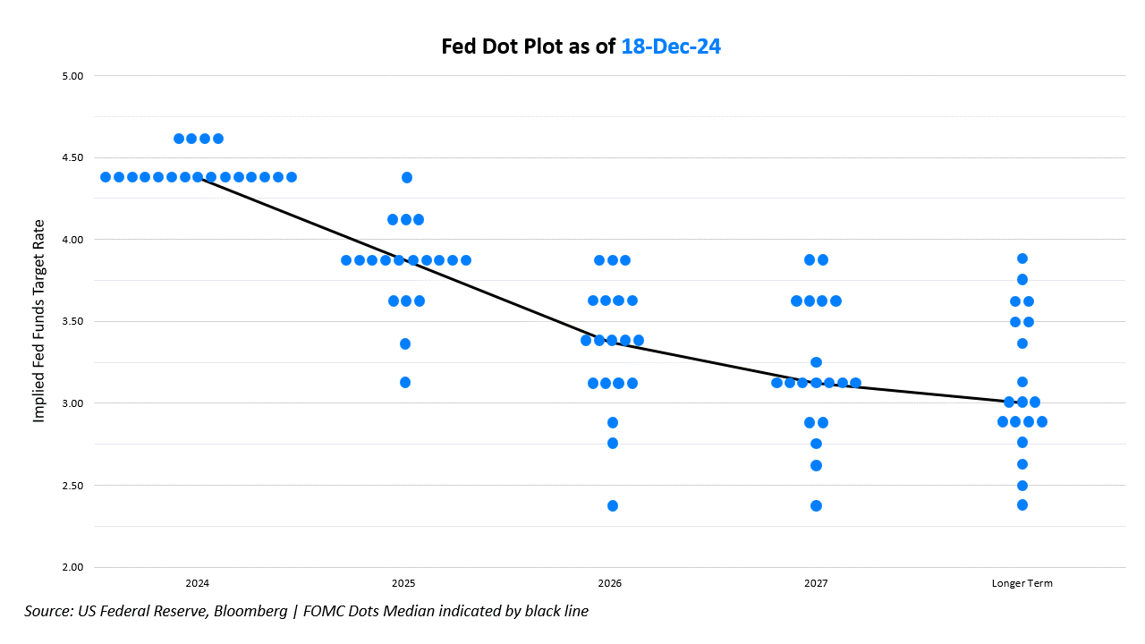 The Fed’s dot plot forecasted the benchmark rate at 3.9% in 2025 (vs. September’s 3.4% projection), indicating 50bp in total rate cuts next year. The Fed’s Summary of Economic Projections (SEP) also showed that officials expected inflation to remain sticky with their Core PCE projections at 2.5% and 2.2% in 2025 and 2026 respectively (vs. 2.2% and 2.0% in Septembers’ forecast).