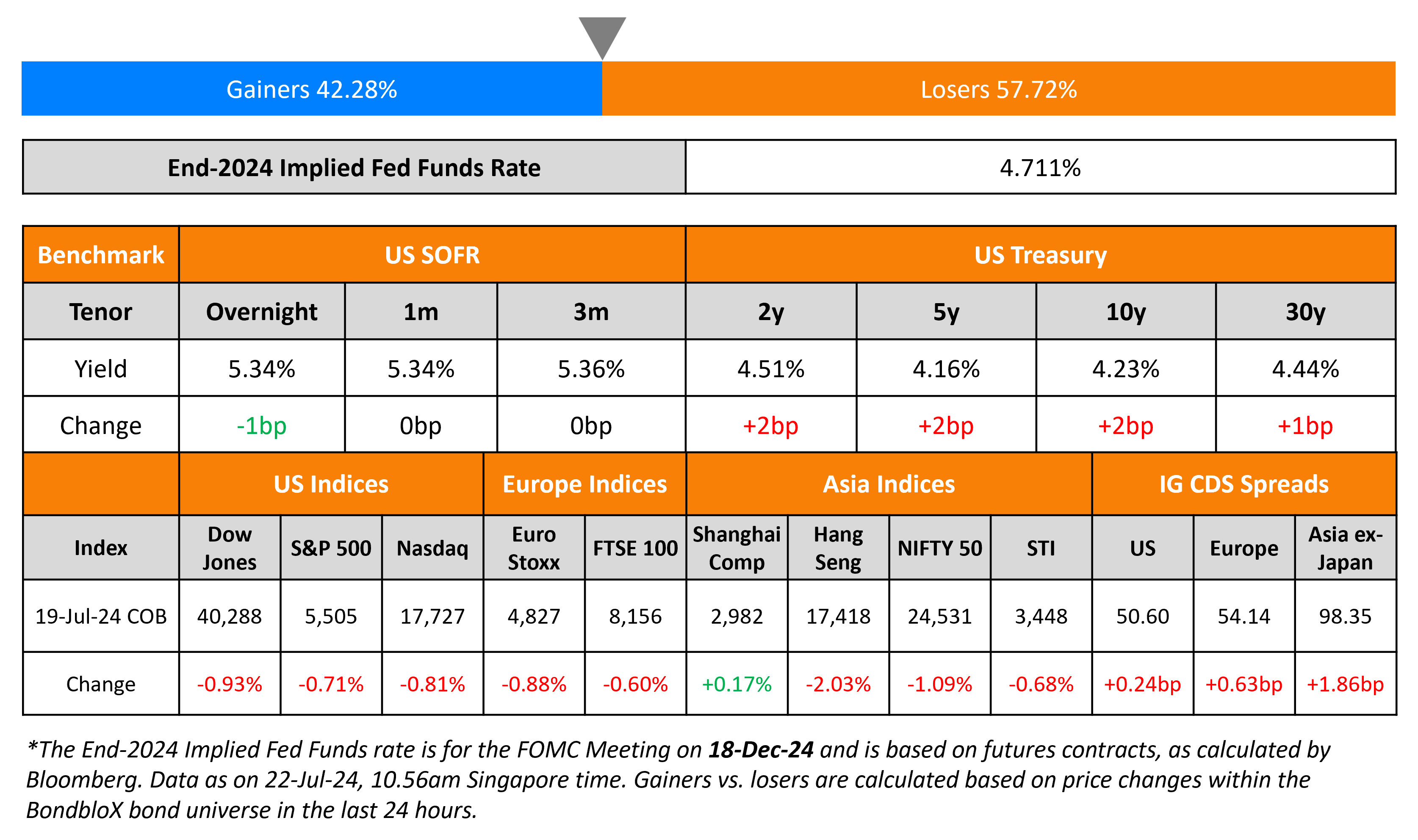 US Treasury yields were 2bp higher across the board. Over the weekend, US President Joe Biden dropped out of the presidential race, endorsing the current vice-president Kamala Harris. Separately, New York Fed President John Williams noted in a speech that the r-star levels are “about the same level as they were before the pandemic”, referring to the long-term neutral rate of interest. Earlier this week, he said that the recent inflation readings were encouraging, but wanted more confidence about it heading back to the 2% target. US equities saw the S&P and Nasdaq continue to drop, by 0.7-0.9%. US IG and HY CDS spreads widened by 0.2bp and 3.3bp respectively.