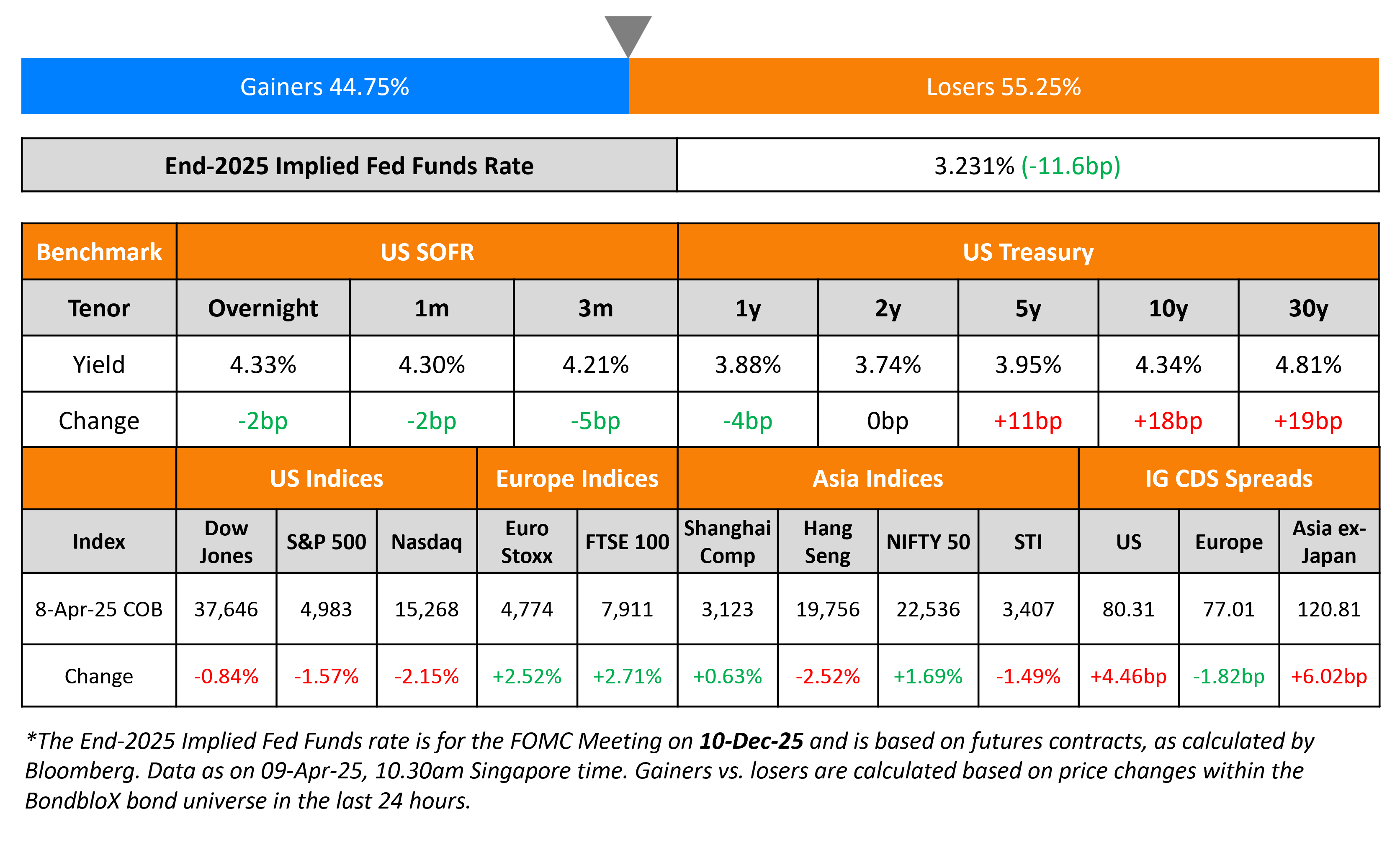 The US Treasury curve bear steepened yesterday with the 10Y and 30Y yields rising by 18-19bp while the 2Y yield held steady. The US NFIB small business optimism index declined to 97.4 from 100.7 previously. This was also below the five decade average of 98. Separately, US President Donald Trump’s tariff roll-out is expected to take place, including a 104% tariff on imports from China.