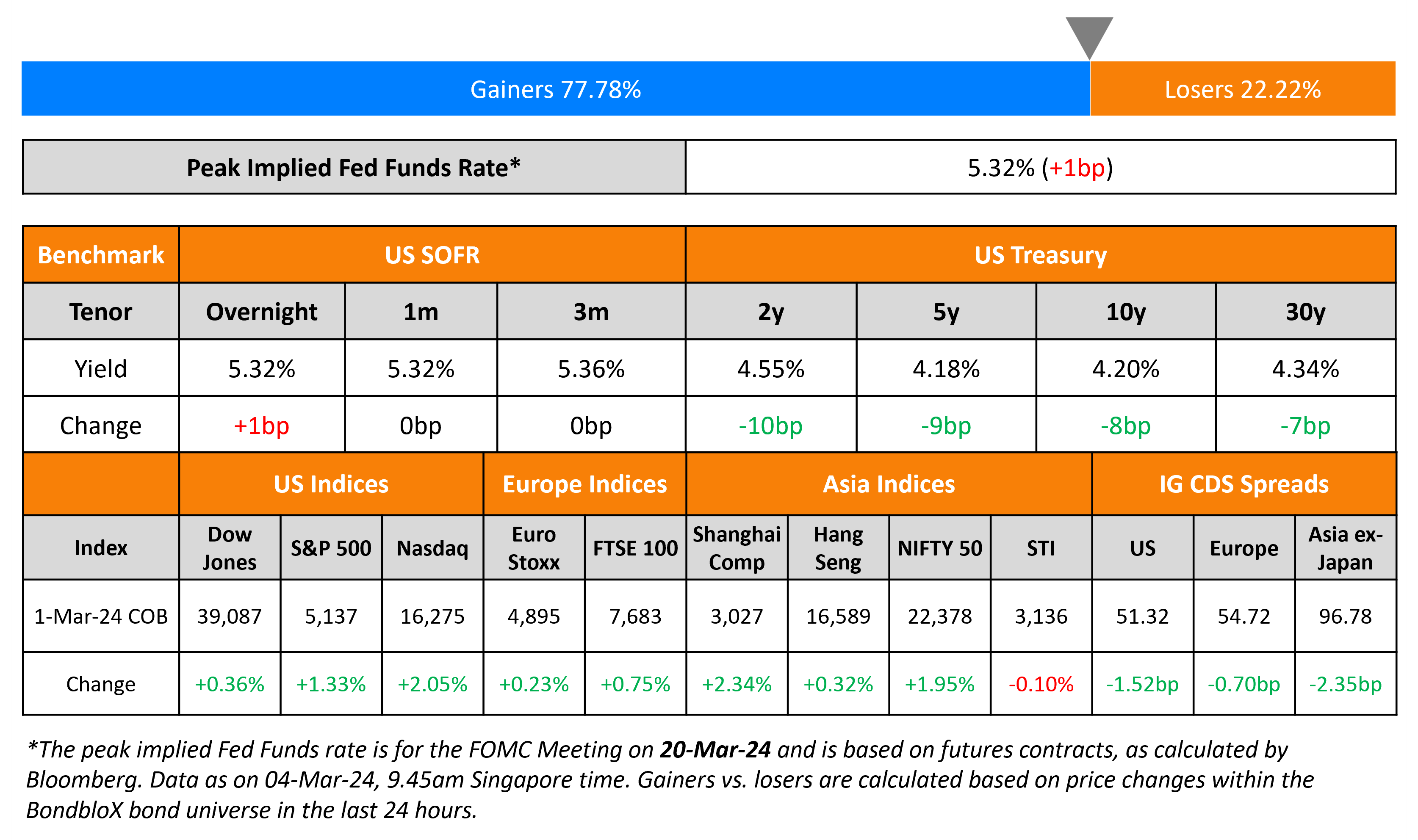 US Treasury yields dropped across the curve, with the 2Y down 10bp to 4.55% and the 10Y down 8bp to 4.20%. This move lower in yields came after the softer than expected ISM Manufacturing print. The ISM Manufacturing Index came at 47.8 in February, lower than expectations of 49.5 and January’s 49.1. There was a dip across most components of the index – the Price Paid Index fell to 52.5 vs. expectations of 53.0; the New Orders Index contracted to 49.2 vs. expectations of 52.7 and; the Employment Index fell to 45.9. Also, the University of Michigan consumer sentiment index saw its first drop in three months to 76.9 in February. Looking at credit markets, US IG CDS spreads tightened 1.5bp and HY CDS spreads were 5bp tighter. Equity markets closed much higher with the S&P and Nasdaq up 1.3% and 2.1% respectively.