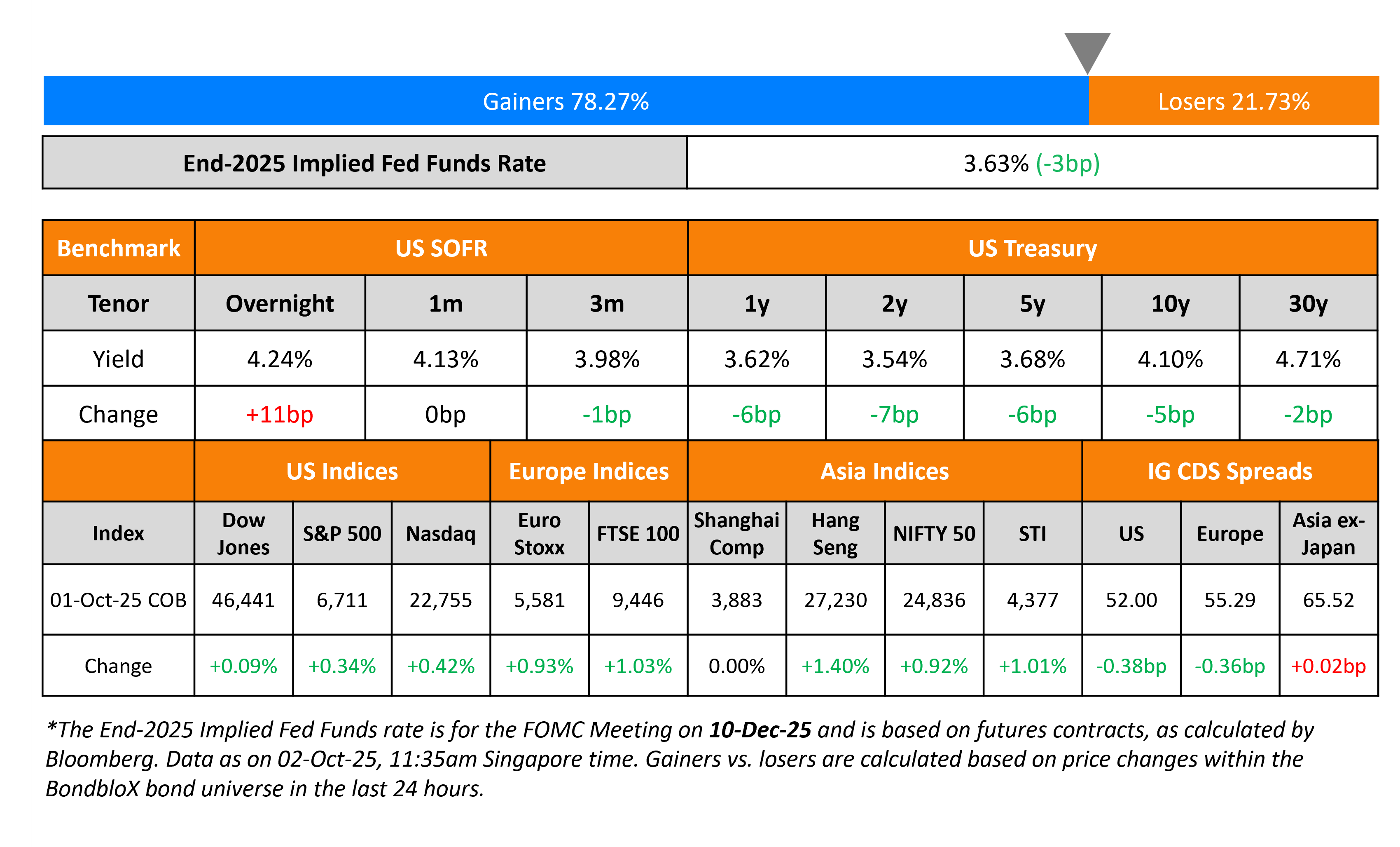 US Treasury yields fell by 5-7bp across the curve on Wednesday. This came on the back of weaker than expected ADP employment data. ADP private payrolls fell by 32k in September vs. expectations of a 51k rise. With the Bureau of Labor Statistics (BLS) not releasing the NFP report on Friday due to the government shutdown, the ADP print gained prominence, thereby swaying Treasuries. Separately, the ISM Manufacturing Index contracted for a seventh straight month, coming-in at 49.1 vs. expectations of 49.0.