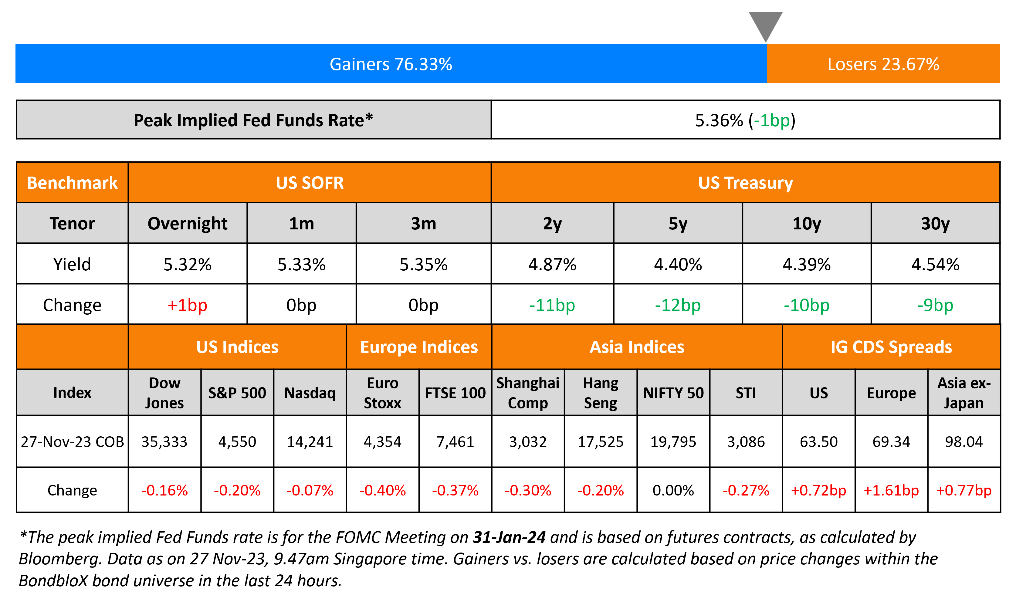 US Treasury yields dropped by over 10bp across the curve. The US Treasury concluded the auction of 2Y and 5Y notes. The $54bn 2Y auction was met with soft demand with a bid-to-cover of 2.54x, down from 2.64x in October and a tail of 1.1bp. The $55bn 5Y auction on the other hand saw strong demand with a bid-to-cover of 2.46x, up from 2.36x in October and a stop through of 0.5bp. Primary dealers took 16.85% of the issue. US credit markets saw IG CDS spreads widen 0.7bp and HY widening 4.1bp. Equity markets were slightly lower with the S&P ad Nasdaq down 0.1-0.2%.