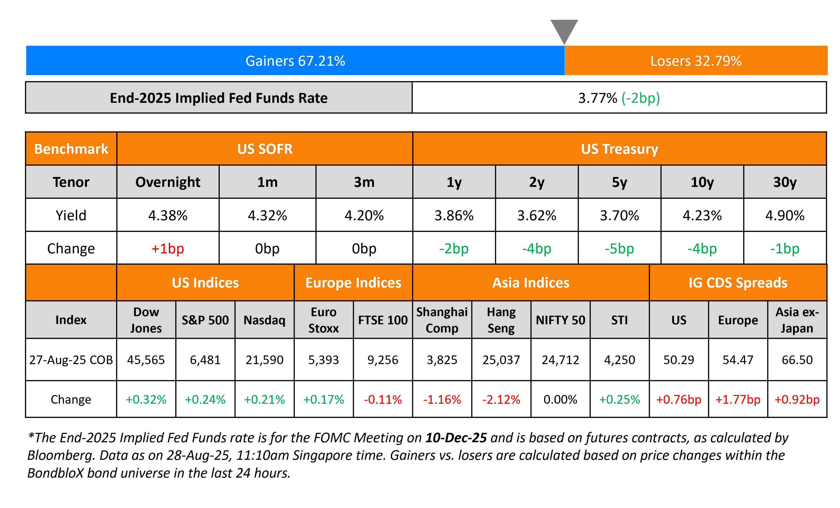 Saudi Awwal Bank raised $1.25bn via a 10NC5 Tier-2 green bond at a yield of 5.947%, 25bp inside initial guidance of T+245bp area. The senior secured note is rated Baa2/BBB (Moody’s/Fitch), and received orders of over $3.3bn, ~2.6x issue size. Net proceeds will be used for to finance and/or refinance, eligible sustainable projects as set out in its sustainable finance framework.