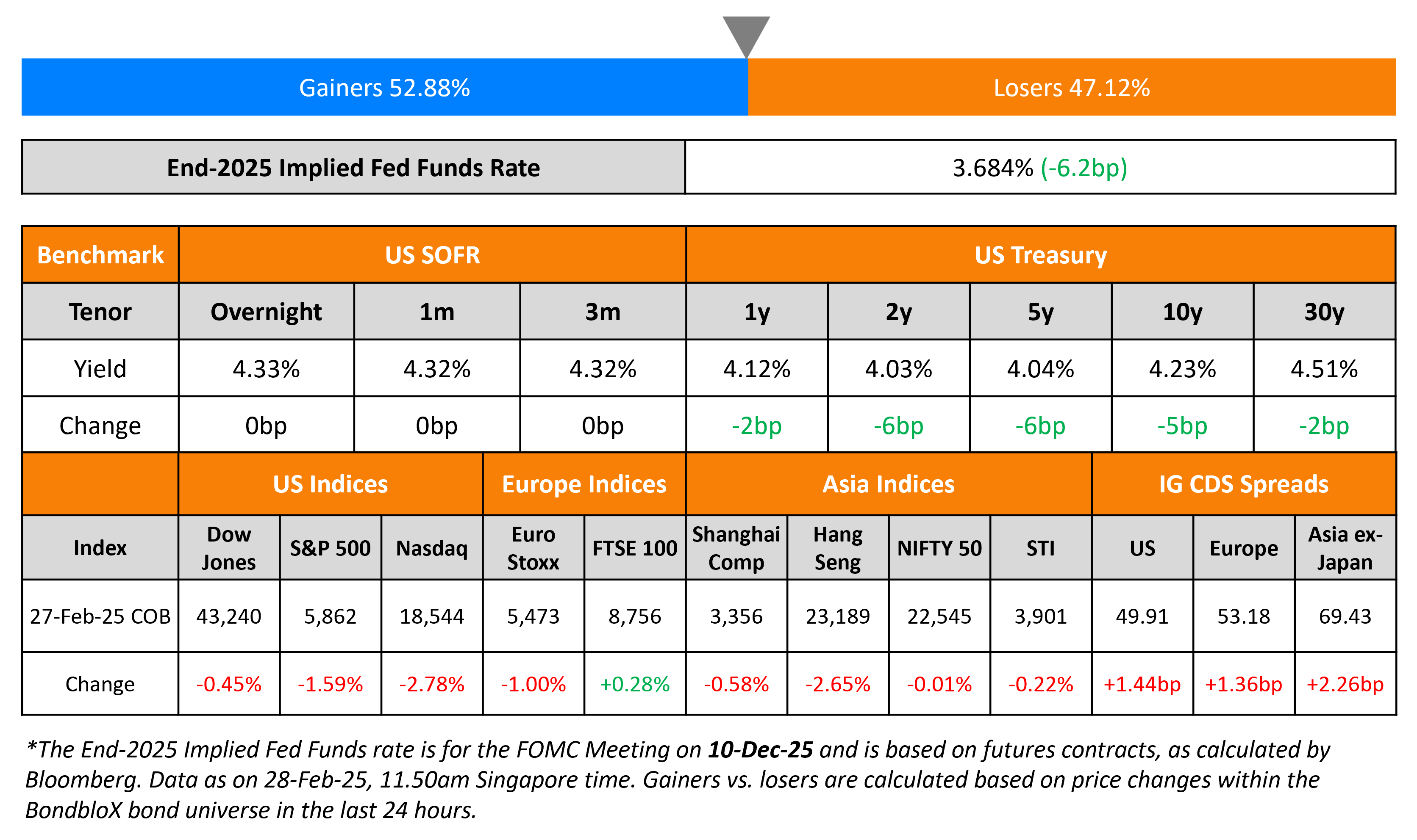 US Treasury yields eased further, down by 5-6bp across the curve again, with the 2Y yield now near the 4%-mark. The second reading for US GDP in Q4 was unchanged from the initial estimate, coming-in at 2.3% QoQ, largely helped by a 4.2% rise in consumer spending. Separately, preliminary Durable Goods Orders rose by 3.1% MoM in January, higher than the surveyed 2.0% print. Initial jobless claims for the previous week rose by 22k, its largest increase in five months to 242k.