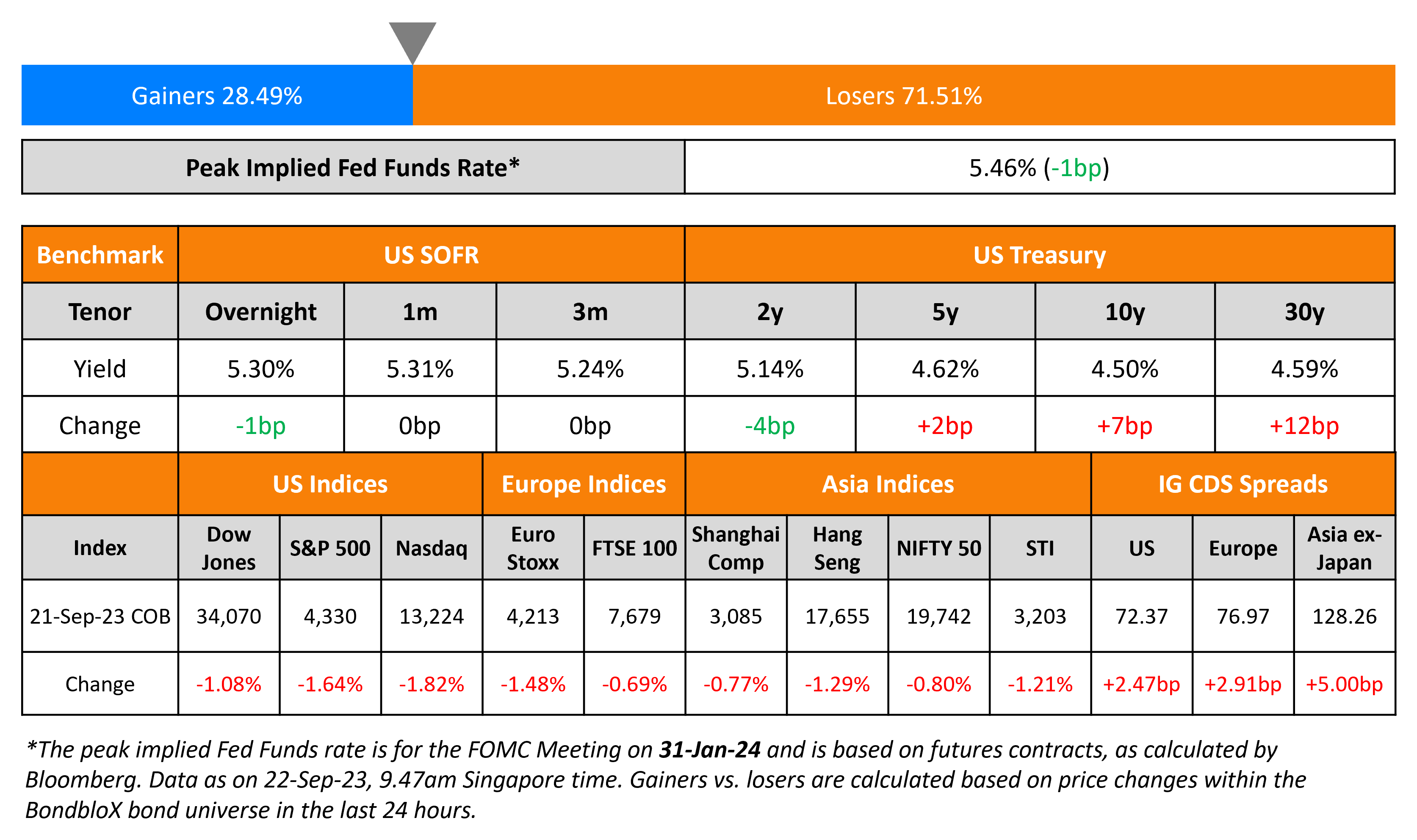 US long-end Treasury yields spiked higher with the 30Y yield up 12bp to 4.59%. However, 2Y yields were down 2bp as the yield curve steepened. The move continues the march higher in yields following a hawkish Fed meeting earlier this week. With the spike in 30Y yields, long-term bonds of IG-rated issuers like Berkshire Hathaway, Amazon, Apple, Boeing, GE, Temasek and others dropped by over 2.5%. US initial jobless claims dropped by 20k to 201k for the prior week. Both credit and equity markets were under pressure with the continued rise in rates. In credit markets, US IG CDS spreads jumped wider by 2.5bp while HY spreads widened by 11.5bp. The S&P and Nasdaq fell 1.6-1.8%.