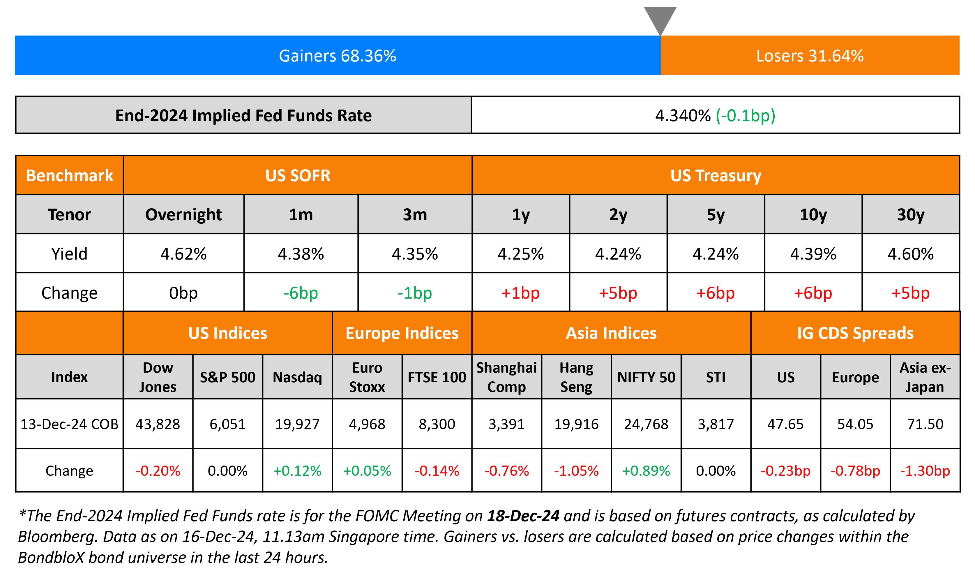 US Treasury yields continued to march higher, rising by 5-6bp across the curve. The Import Price Index rose by 0.1%, better than expectations of -0.2%. With no major data points on Friday and the FOMC meeting due later this week, markets are pricing-in a 93% probability of a 25bp rate cut.
