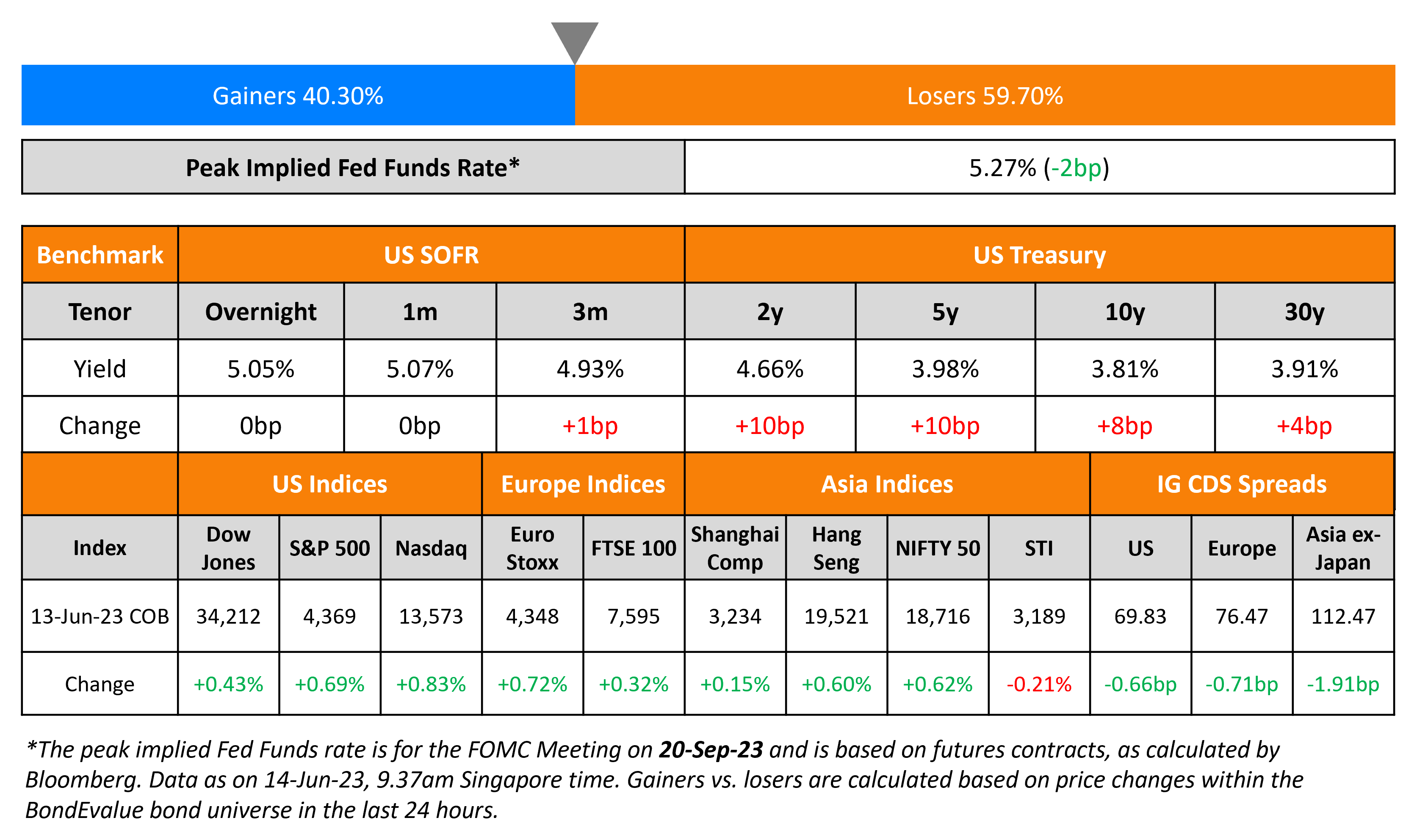 US Treasury yields jumped higher by 8-10bp led by the 2Y and 5Y yields following the CPI print. US CPI for May 2023 rose by 4.0%, lower than expectations of 4.1% and the previous month’s 4.9%. Core CPI came at 5.3%, higher than expectations of 5.2%, and lower than the previous month’s 5.5%. The inflation print broadly saw markets confirming a Fed rate pause (94% probability) at today’s FOMC meeting whilst also reducing expectations of rate cuts later this year. For the July meeting, markets are pricing in a 61% probability of a 25bp rate hike. The peak Fed Funds Rate was 2bp lower at 5.29% for September. Equity indices ended higher with the S&P and Nasdaq up by 0.7-0.8%. US IG and HY CDS spreads tightened 0.7bp and 2.5bp respectively.