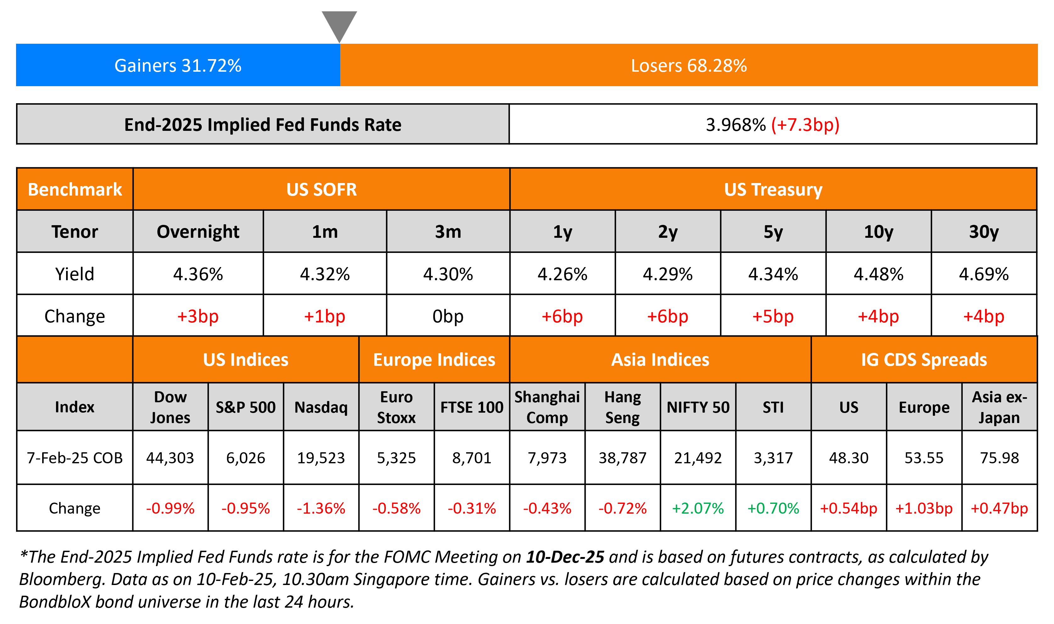 US Treasury yields moved higher by 4-6bp across the curve. US Nonfarm Payrolls for January came-in at 143k, below estimates of 175k. However, December’s number was revised higher to 307k from 256k. Average Hourly Earnings (AHE) YoY rose 4.1%, much higher than expectations of 3.8%. The Unemployment Rate declined to 4.0% from 4.1%. US President Donald Trump said that he will announce new 25% tariffs on all steel and aluminum imports. He added that he plans to announce reciprocal tariffs too, noting that the US would match tariff rates levied by other countries, and that this would apply to all countries.