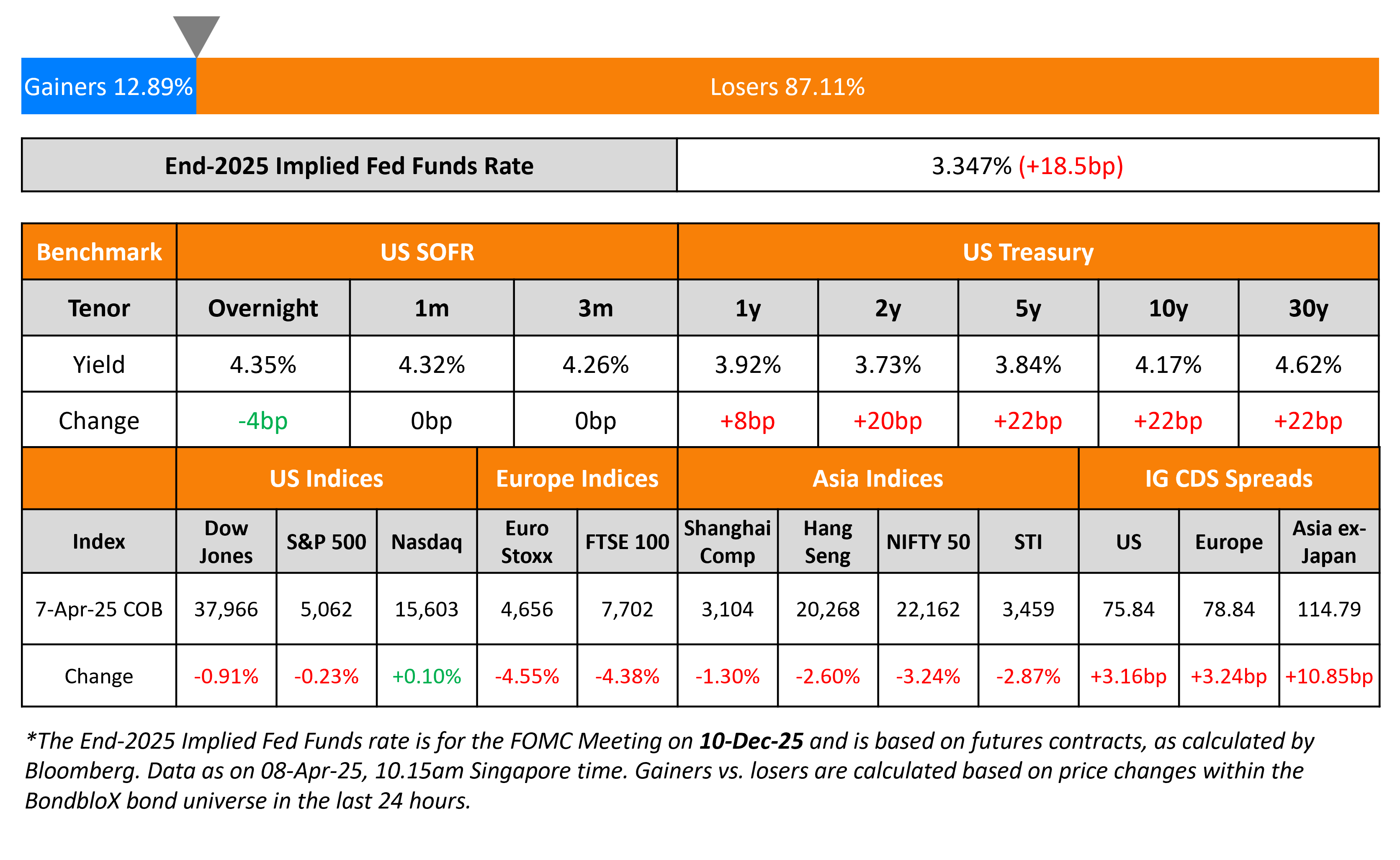 US Treasury yields soared higher by over 20bp across the curve on Monday. US President Donald Trump said that he will impose an additional 50% tariff on China from April 9 if China does not go back on its retaliatory 34% tariffs. He added that the US would also terminate all talks with China, while starting negotiations with other countries.