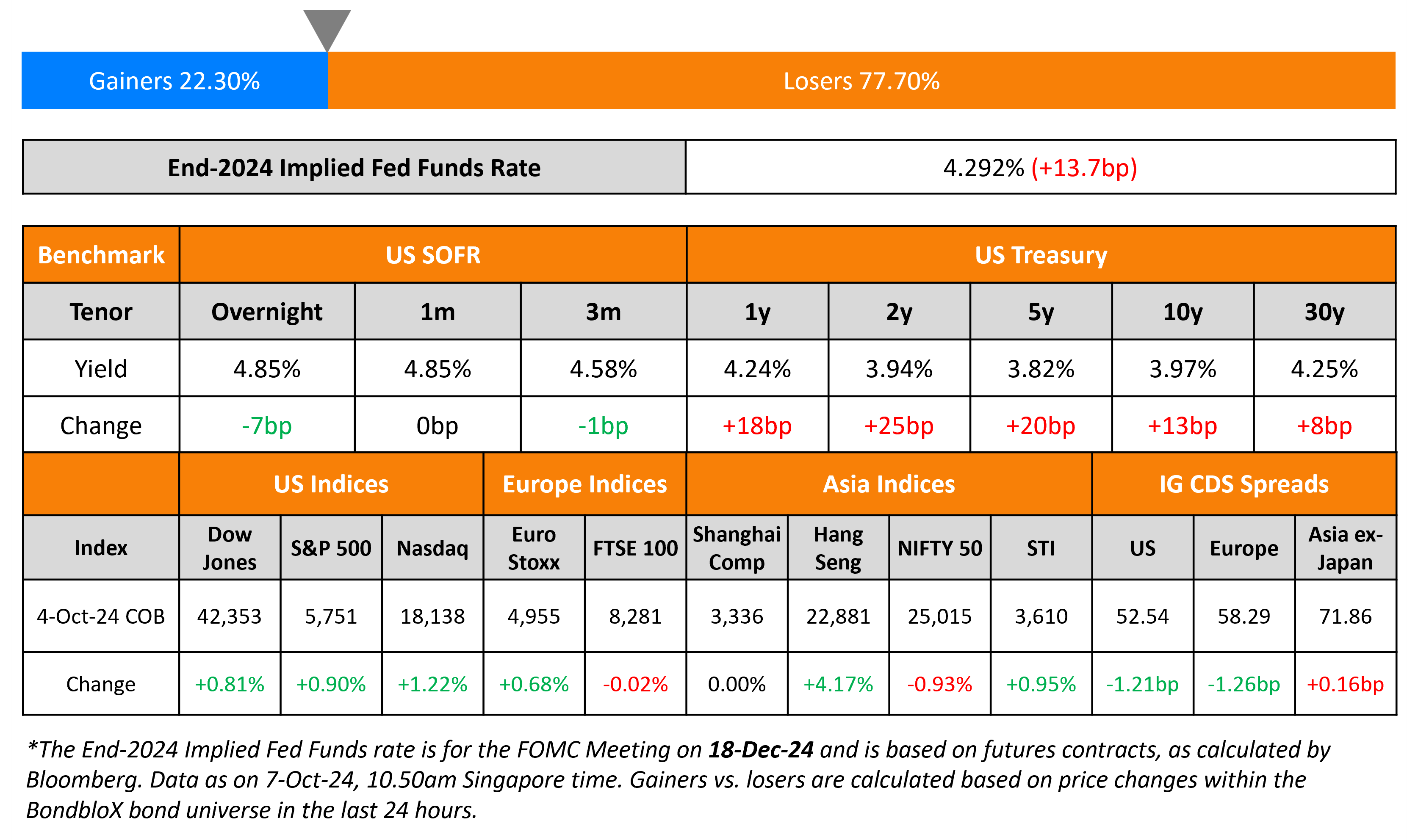 US Treasury yields surged higher across the curve, after the jobs report outperformed on all fronts. The 2Y yield jumped 25bp and the 10Y was up 13bp, as the curve bear flattened. US Non Farm Payrolls (NFP) for September saw a rise of 254K, higher than surveyed 147K. AHE YoY rose by 4.0%, higher than the surveyed 3.8%. and the Unemployment Rate stood at 4.1%, lower than surveyed 4.2%. Chicago Fed President Austan Goolsbee said that while the jobs report was “superb”, he still saw rate cuts coming ahead. Markets are now pricing-in just about 50bp in rate cuts from now through end-2024. US IG CDS and HY CDS tightened by 1.2bp and 6bp respectively. Looking at US equity markets, S&P and Nasdaq both closed higher by 0.9% and 1.2% respectively.